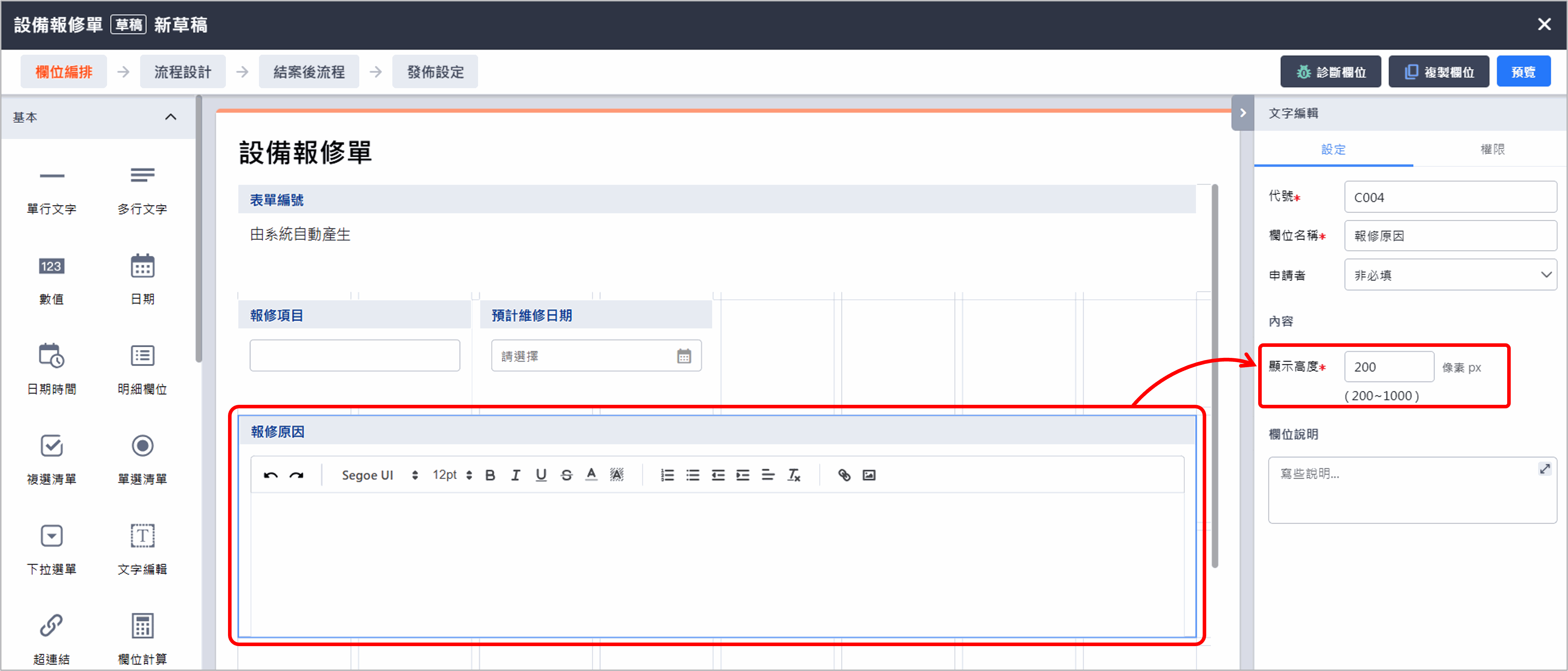依照各個欄位特性在[設定]的頁籤中有屬於該欄位需要維護的項目,並且可以決定 申請者 的填寫與觀看權限。然而在[權限]的頁籤中,可以決定 每一站簽核者 的填寫與觀看權限,若想要指定某一站簽核者的權限則可以到 流程設計 中來進一步設定。