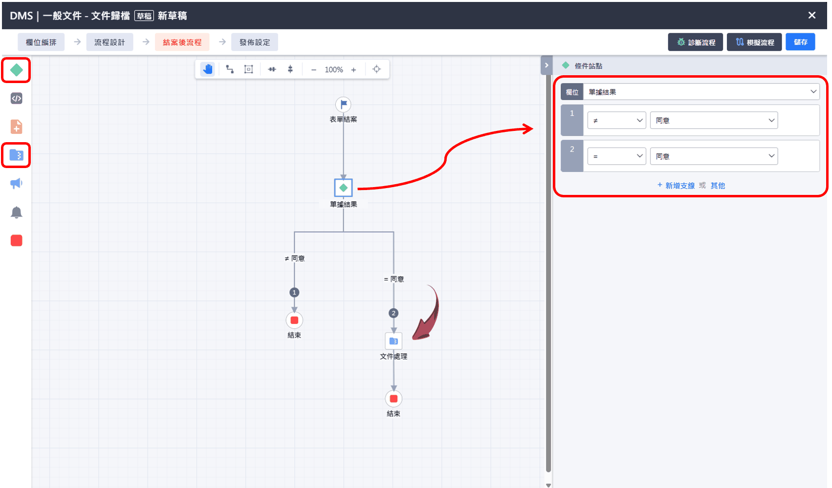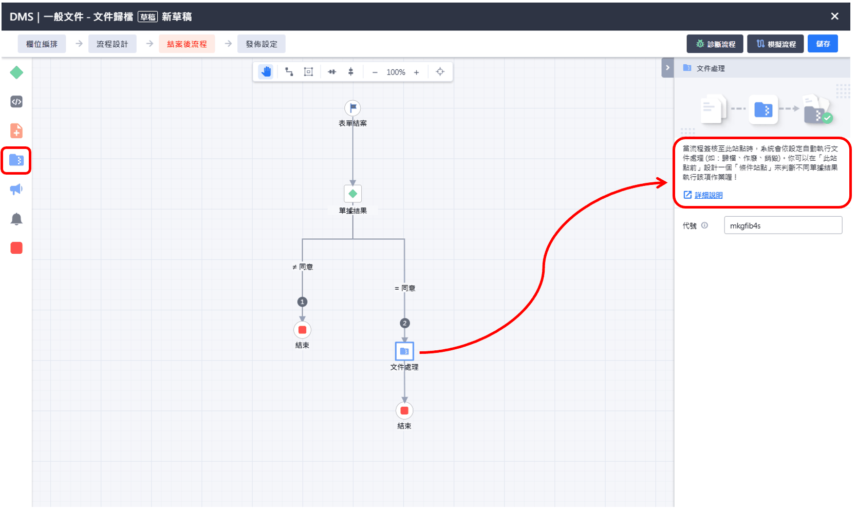 使用範例:在表單中設計{文件管理}欄位,並在{結案後流程}搭配條件站點,設定[同意]結案時接一個{文件處理}站點,系統就會在同意結案後,將{文件處理}欄位的檔案依照使用者設定的[歸檔檔名]存放至指定的[歸檔路徑]中執行{歸檔}或是對指定文件執行{作廢/銷毀}處理。