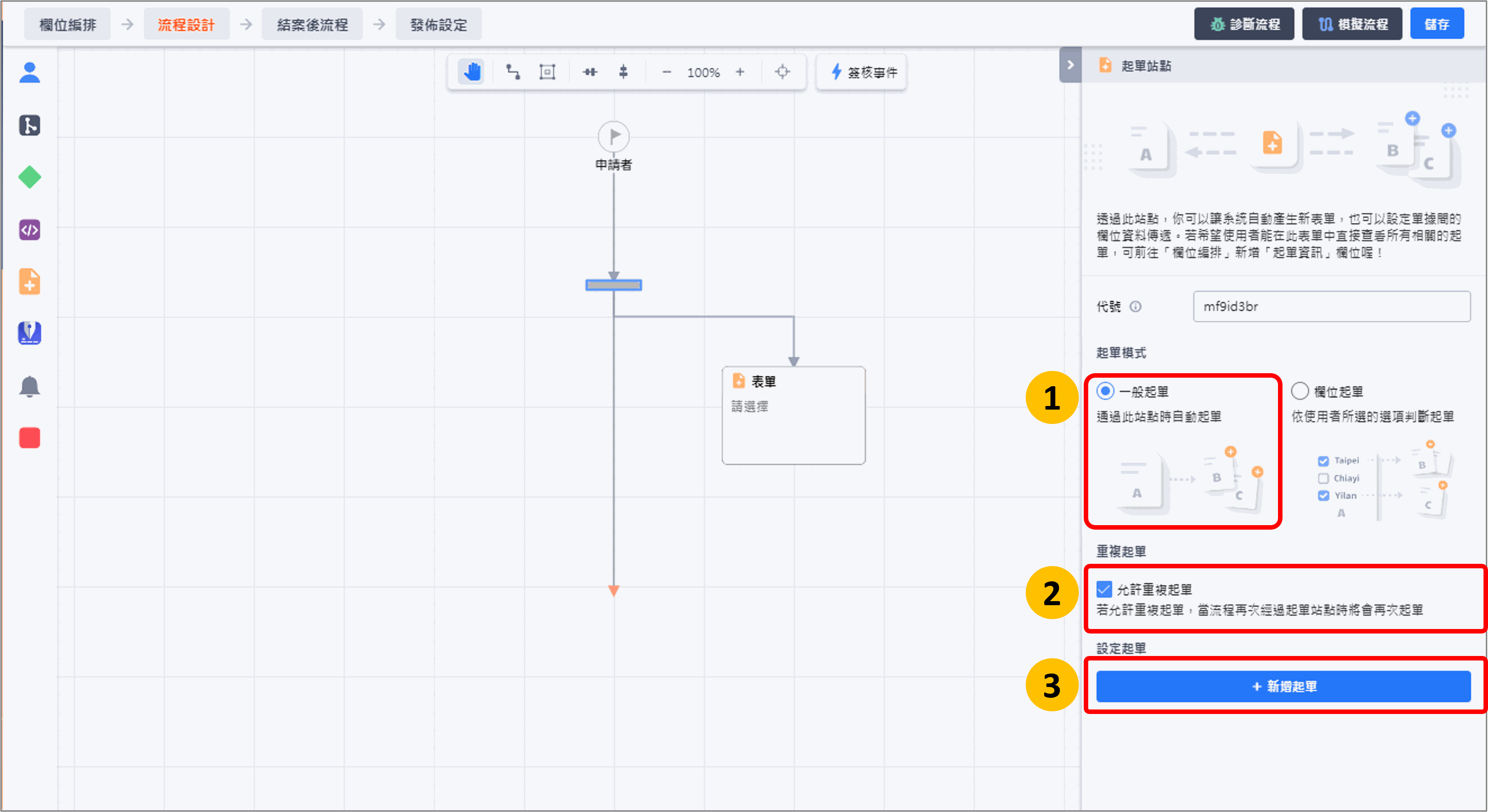 - step3:於[設定起單]內,點按 +新增起單,即可設定1張以上表單的起單規則,讓系統可以根據設定值自動完成起單程序。