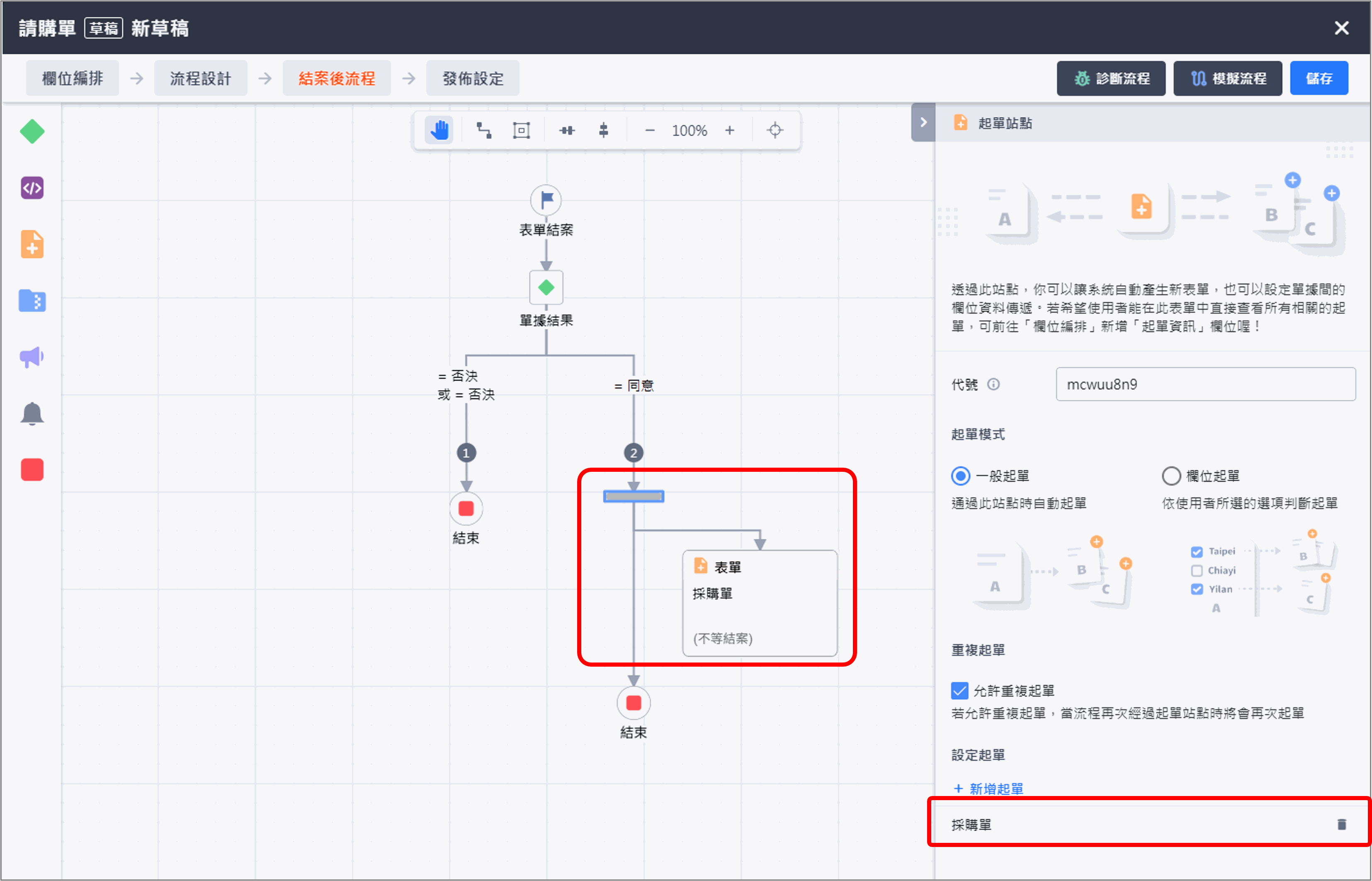 - 畫面返回流程設計頁面,確認流程設計無誤後,[儲存] 整張流程設計,即完成起單站點設定。