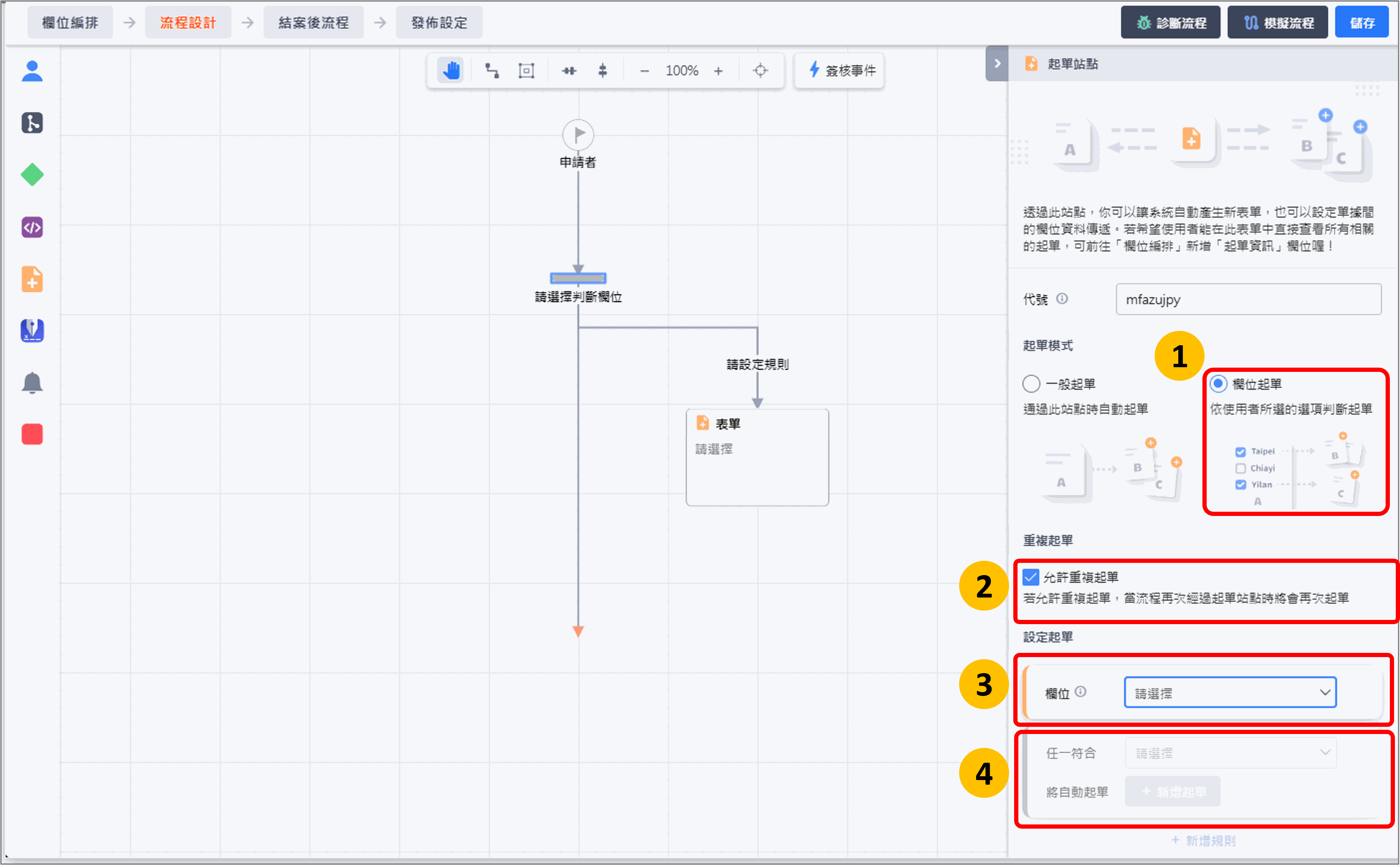 - step3:於[設定起單]內,先選擇表單內的某一個【複選】欄位作為起單判斷依據,例如「會辦部門」。