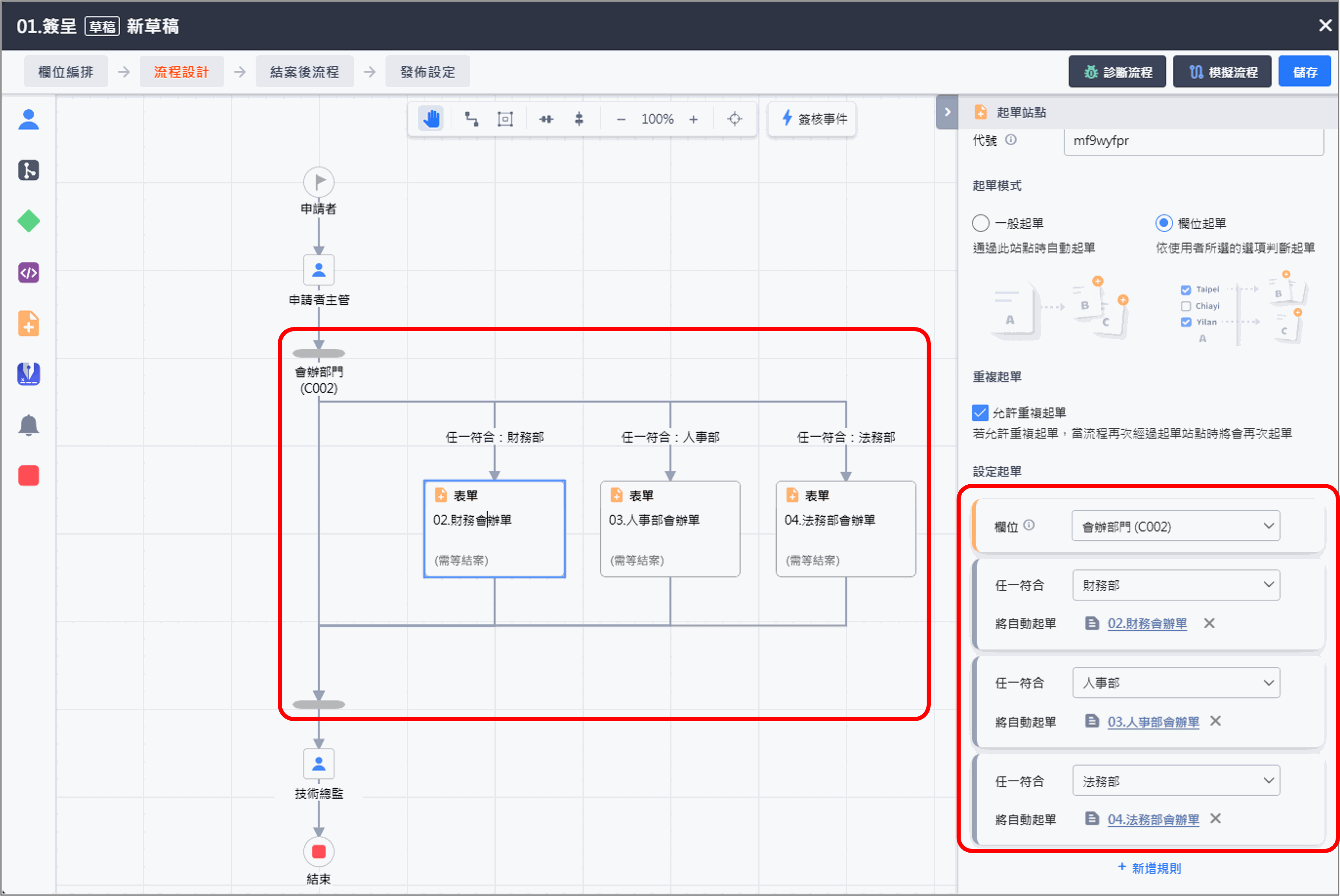 - step4:點按+新增起單,針對欄位中的每個選項值,設定對應要起的表單,例如:「財務部 → 財務部會辦單」、 「人事部 → 人事部會辦單」、「法務部 → 法務部會辦單」