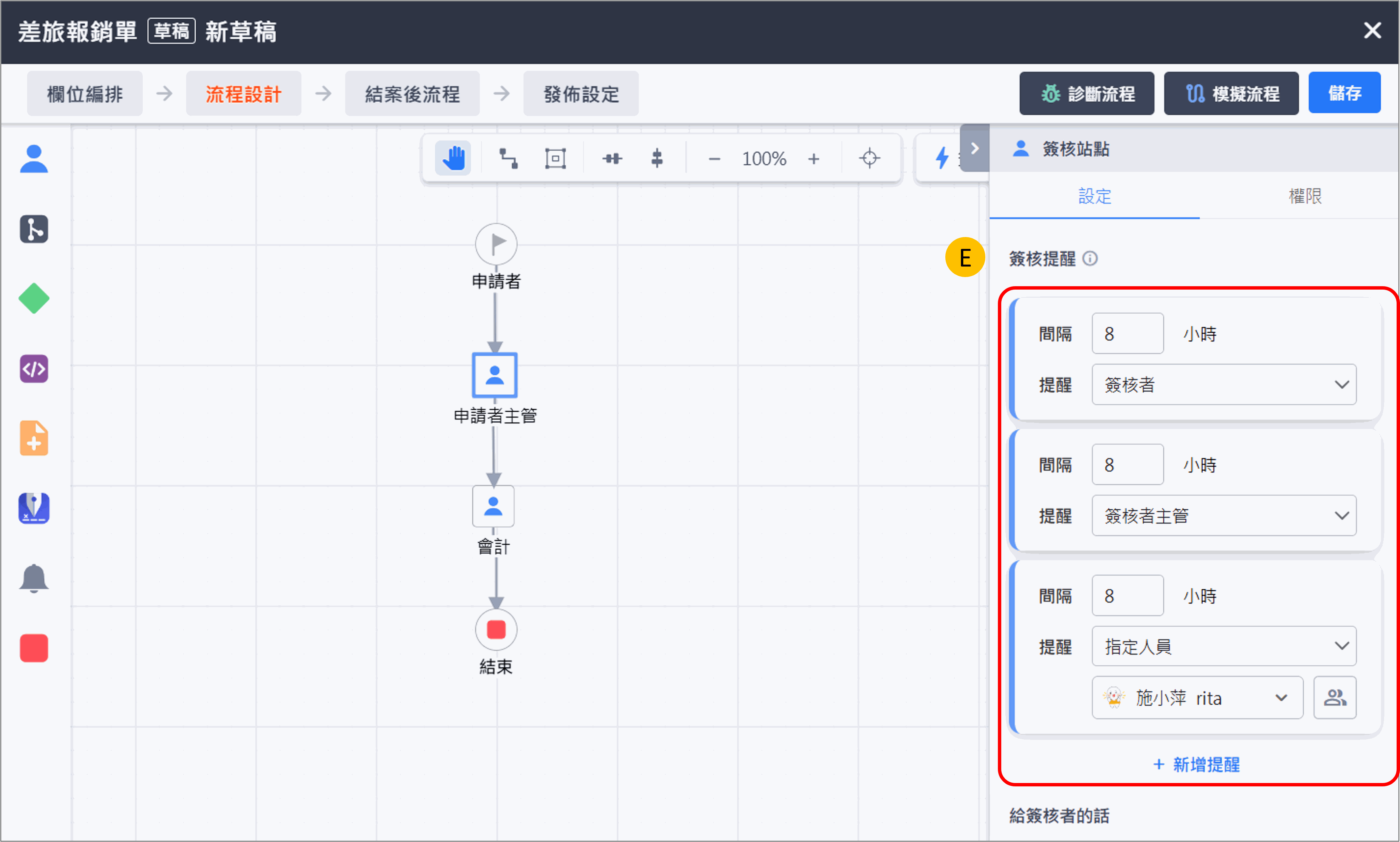 協助表單設計者自訂提醒規則與通知對象,系統將依據設定的【提醒頻率】與【提醒人員】自動寄發通知,避免簽核流程延誤,通知對象分為三種: