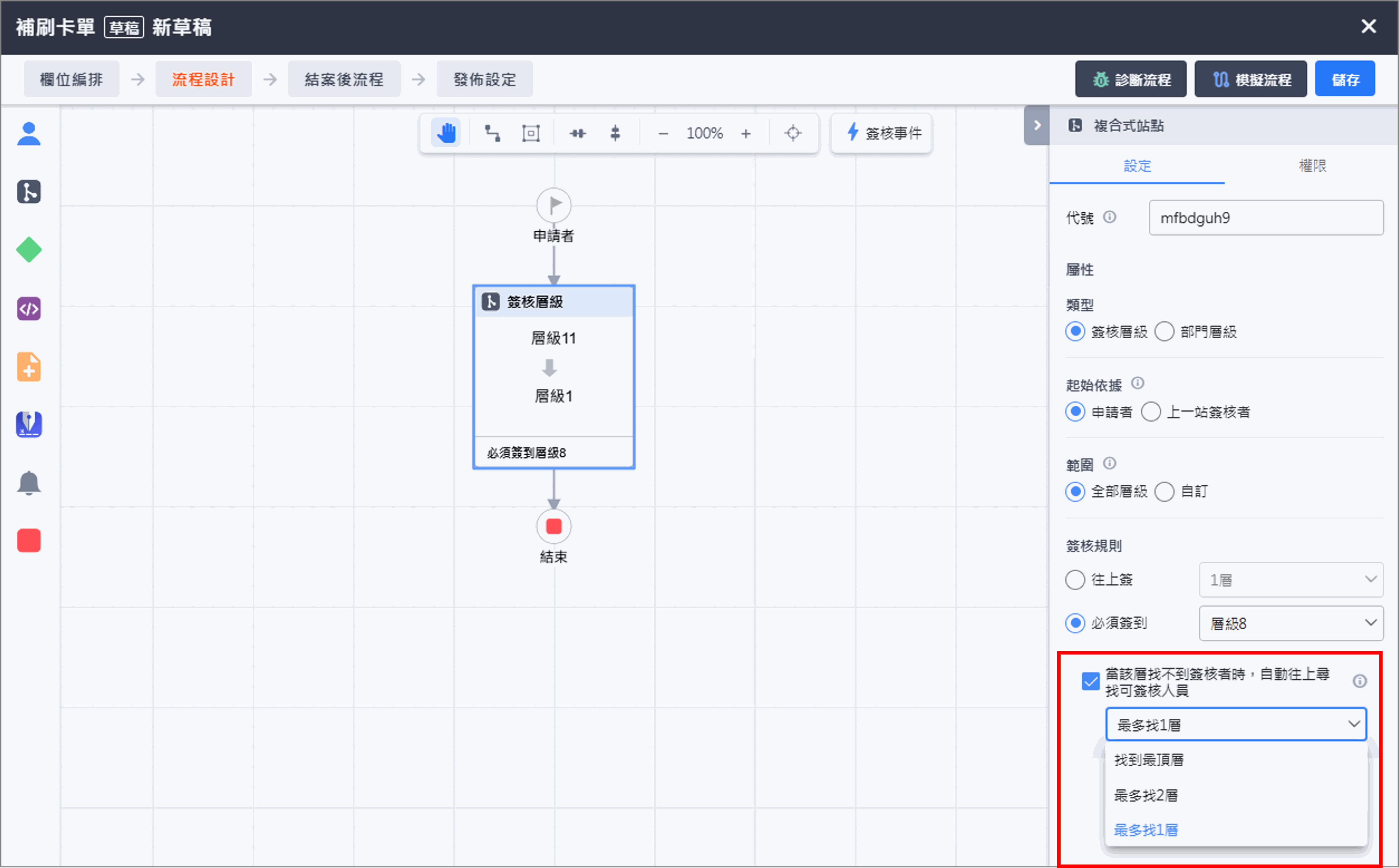 此規則會要求流程至少必須簽到指定層級;若指定層級可能發生找不到簽核主管的情況,表單設計者可以啟用 「自動往上尋找可簽核人員」 功能,直到完成指定層級簽核。