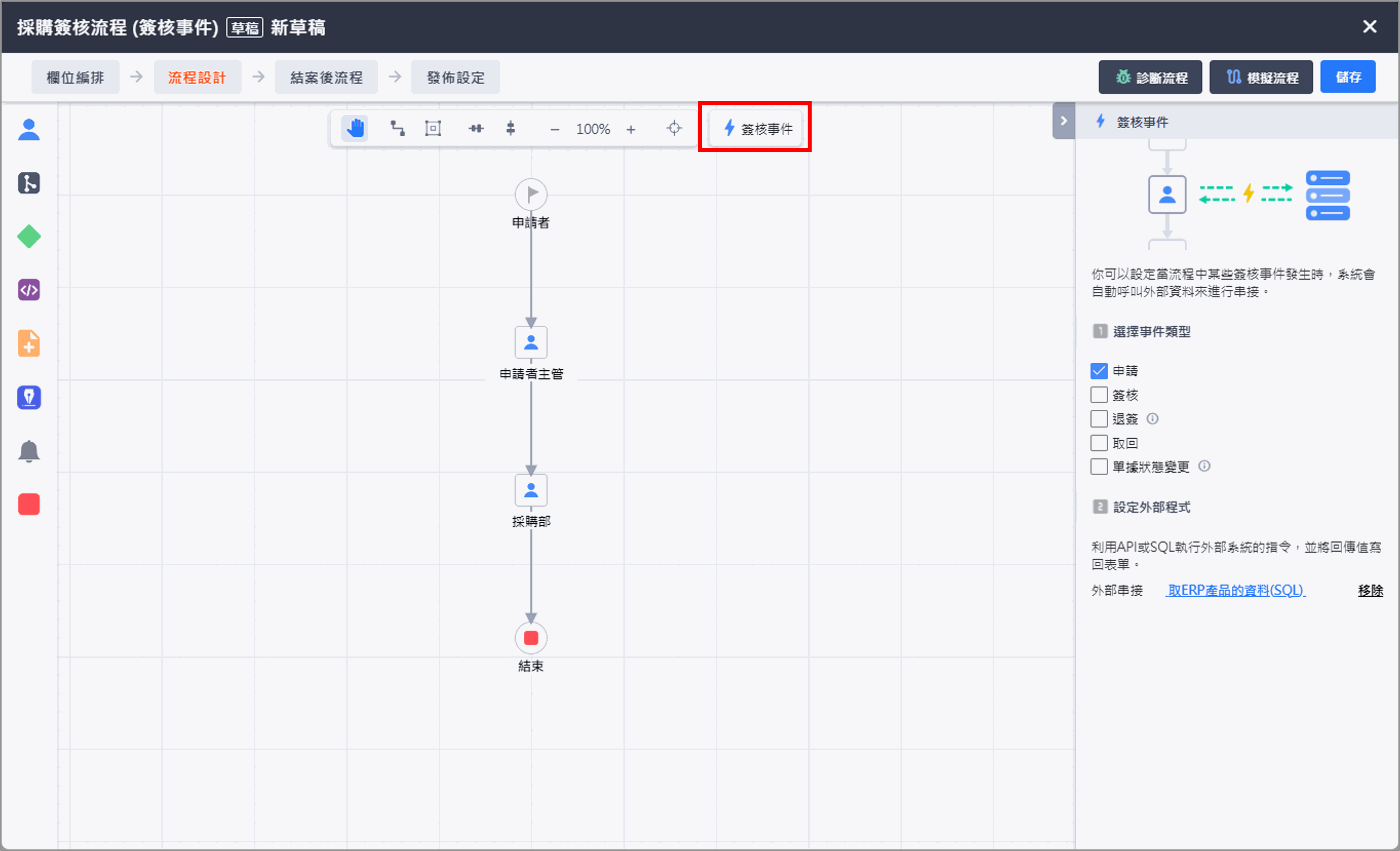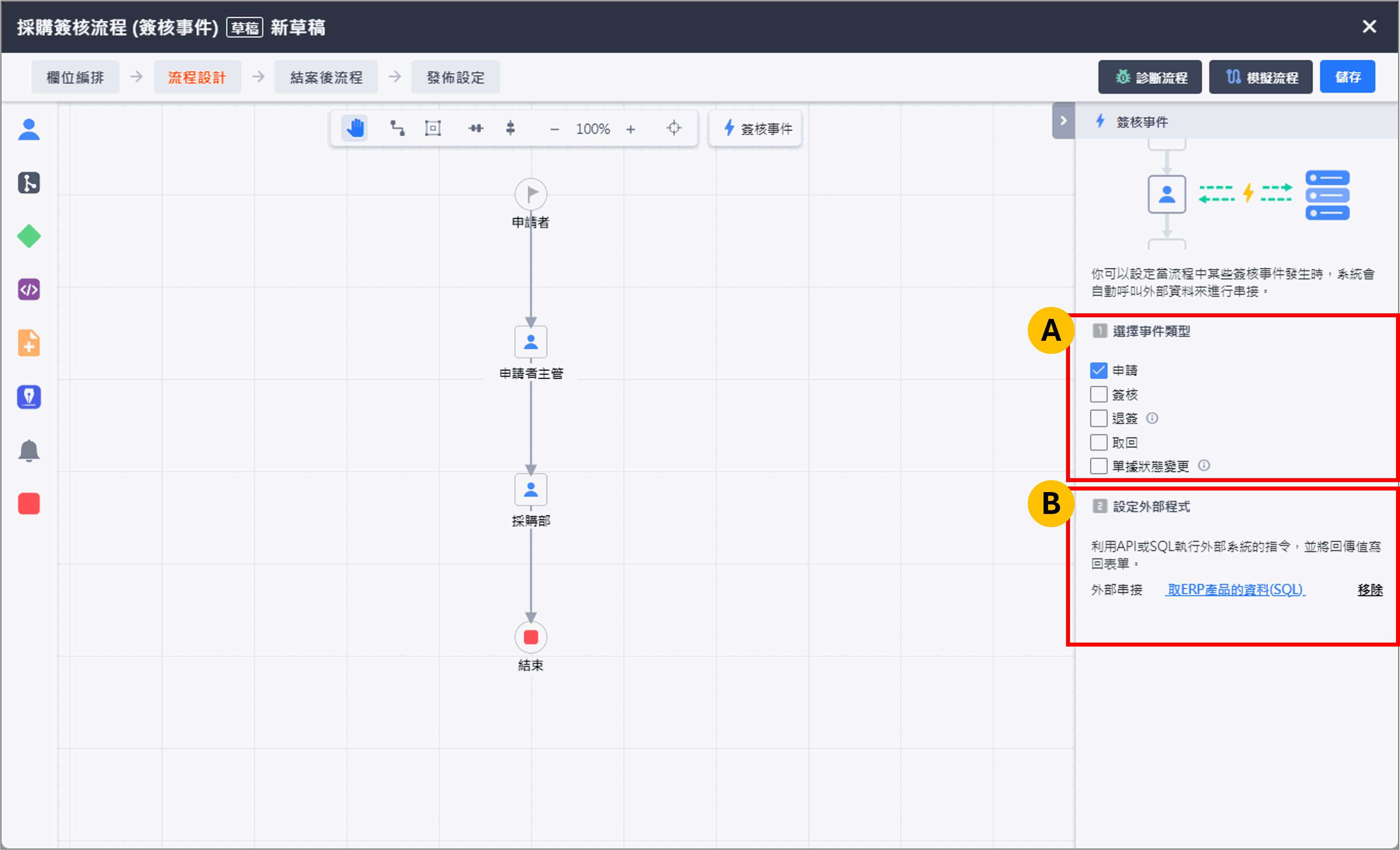 - 當使用者的操作符合所設定的簽核事件時,即可以呼叫所指定的 外部資料來源 。