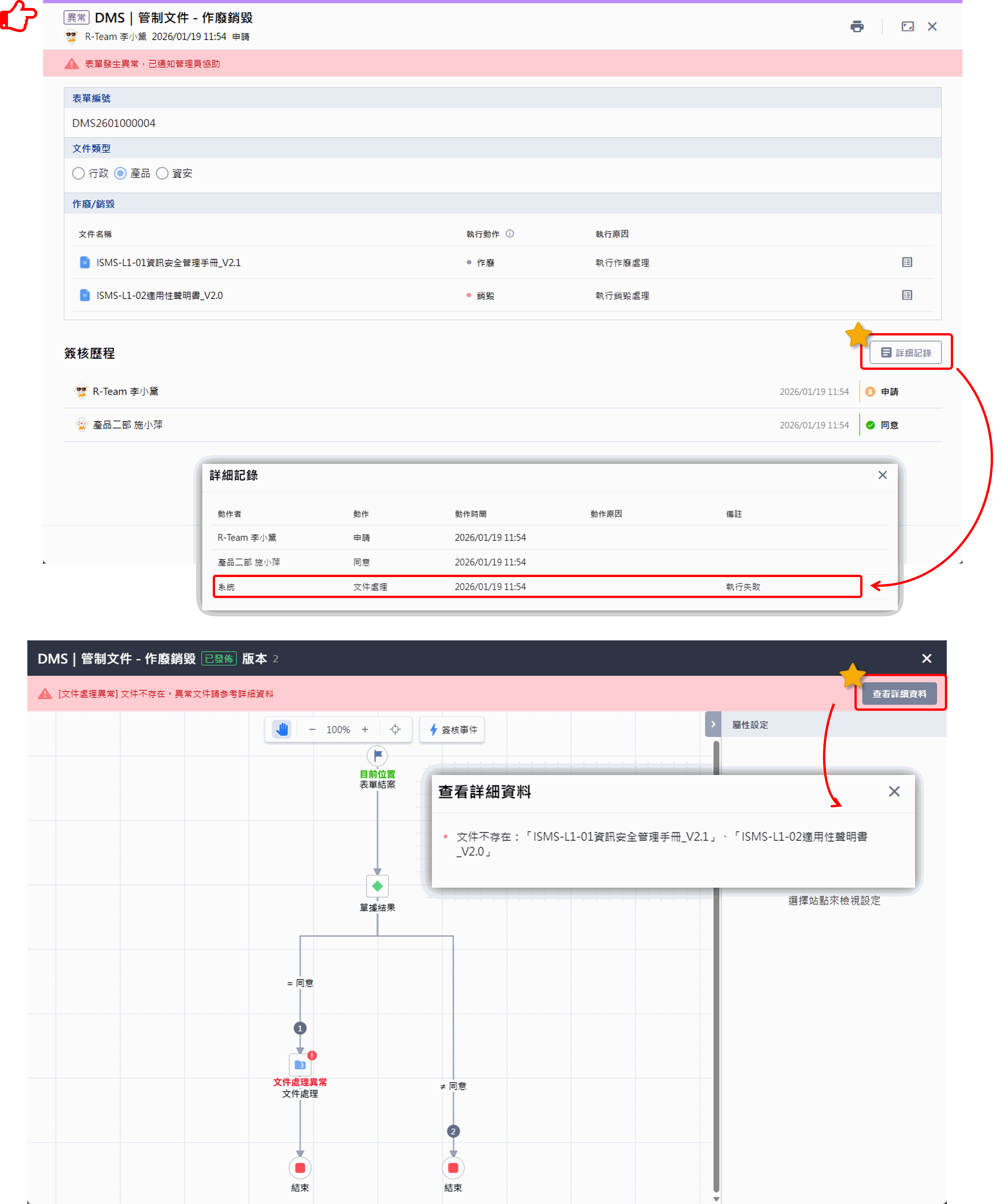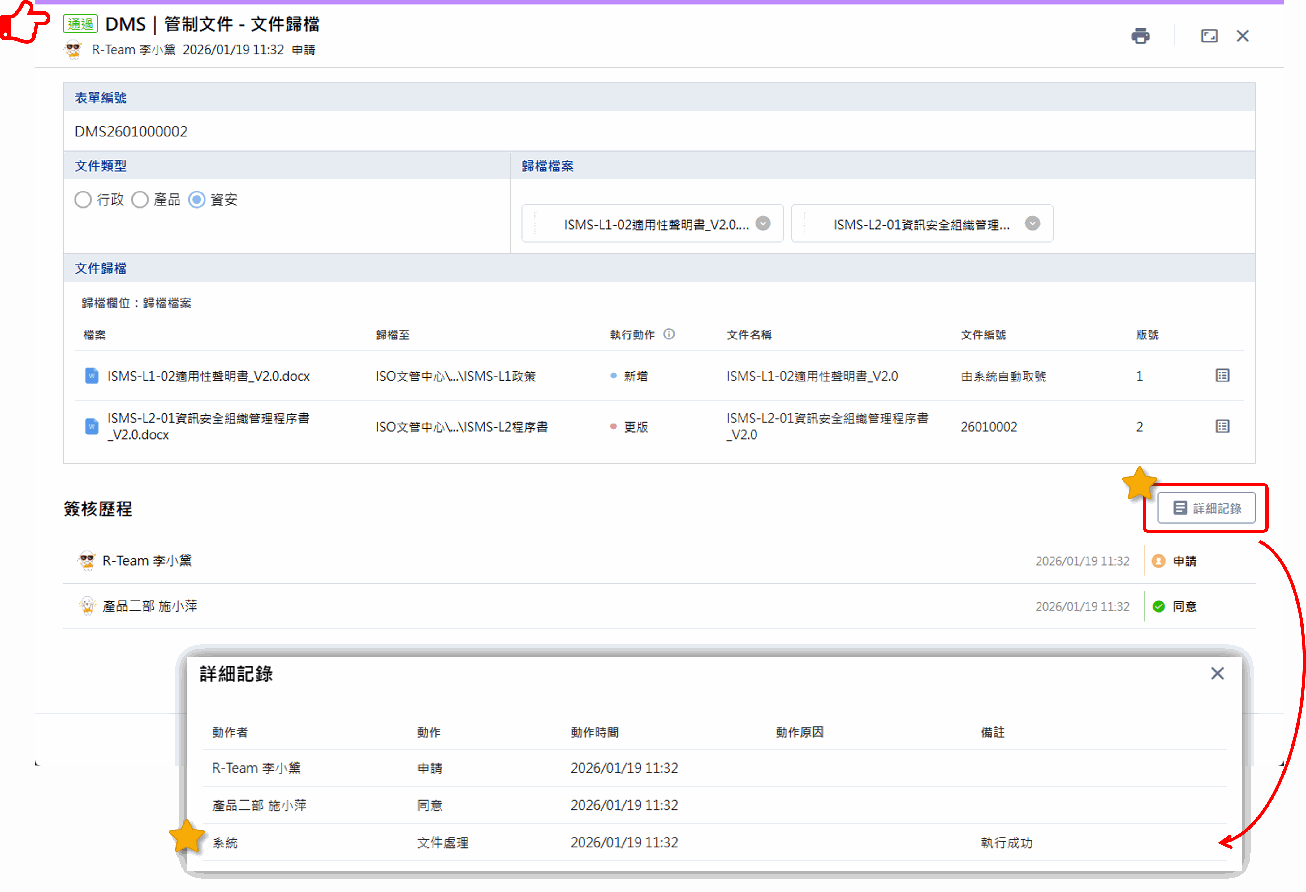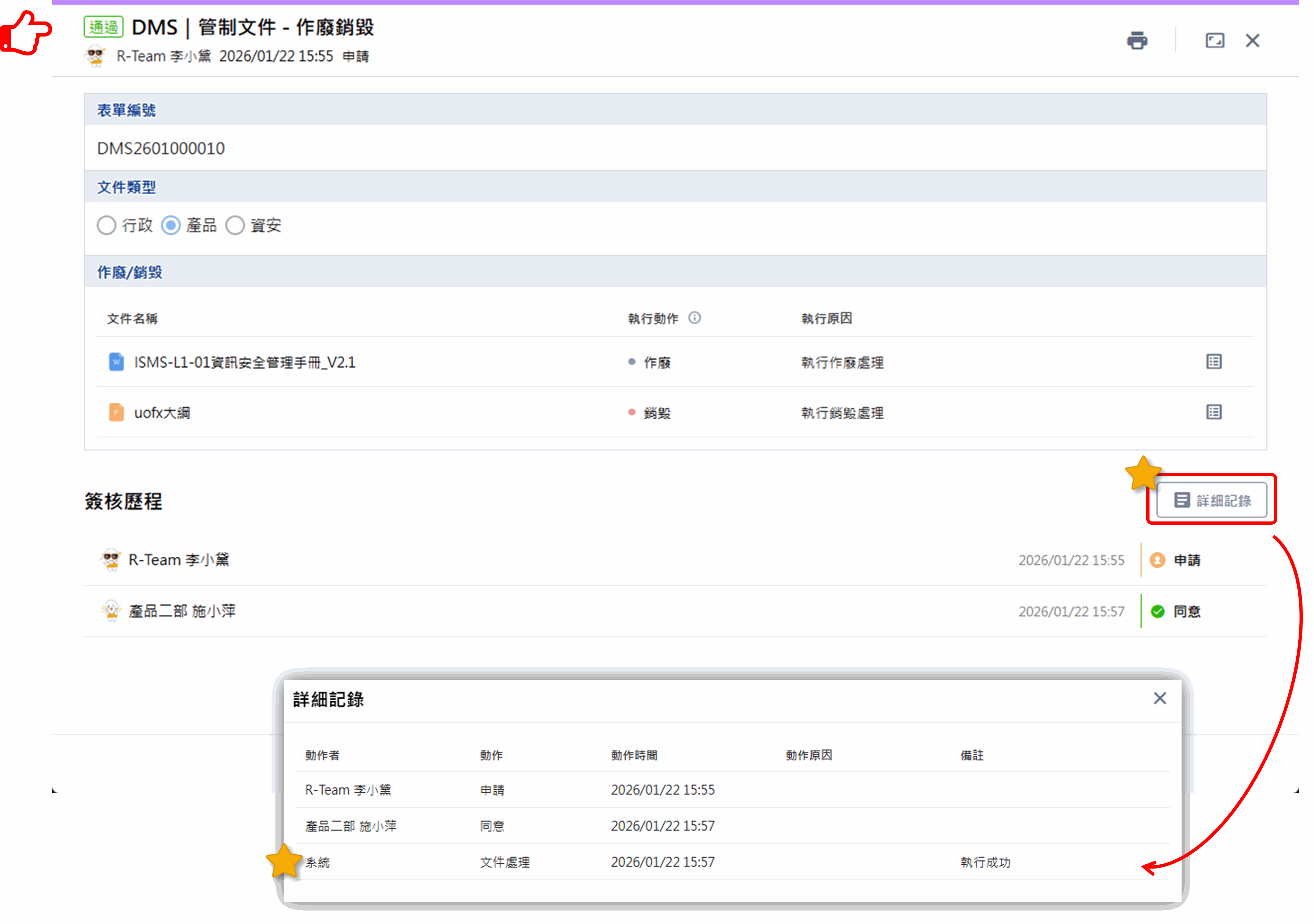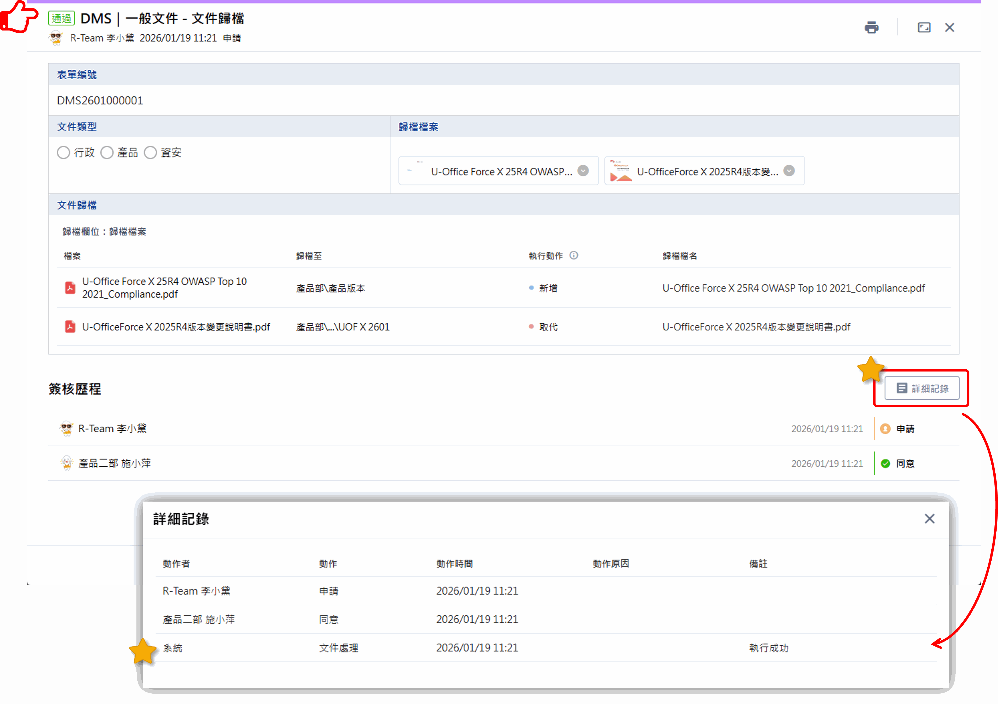 在文件處理完成後,可以從表單的 詳細記錄 中查看文件的執行紀錄與結果。
