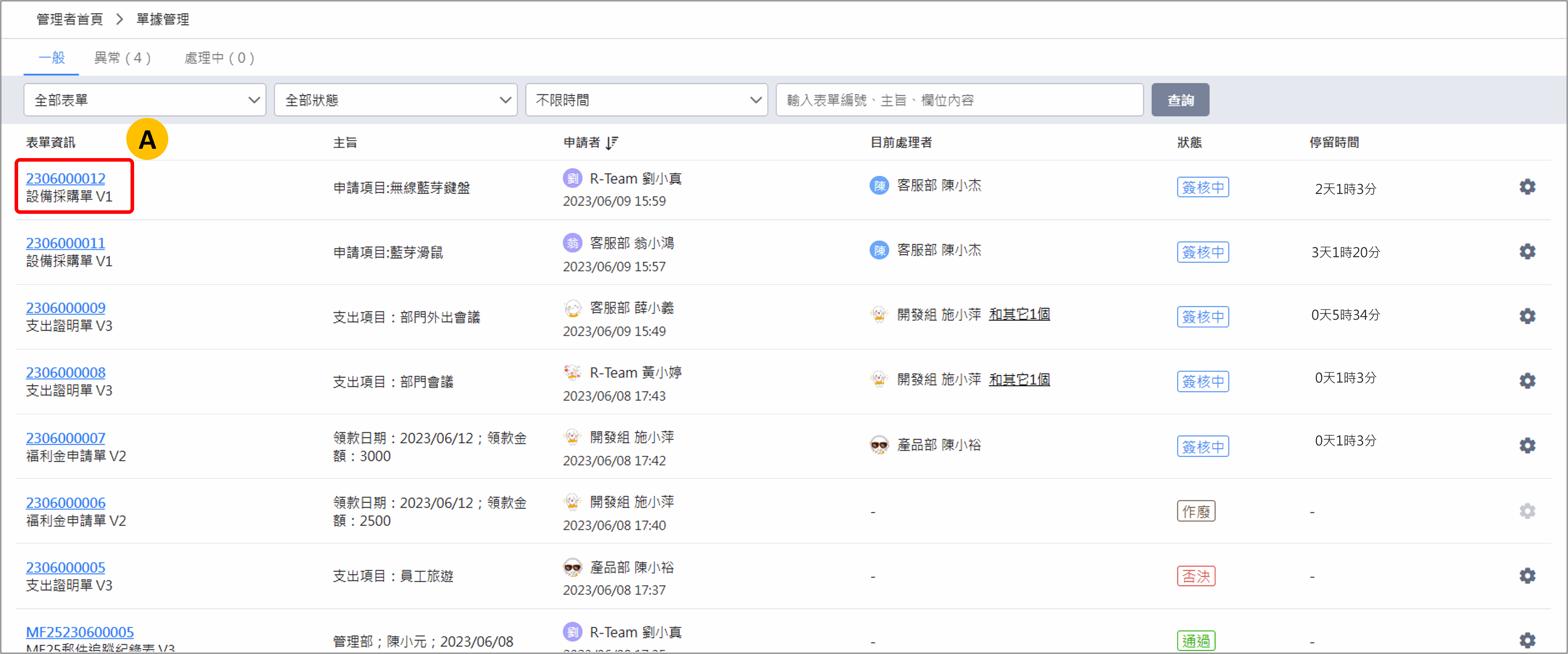 當您擁有該張表單的 表單負責人 權限時,你可以透過單據管理功能查詢到所有人員申請的表單,並且可以清楚地掌控簽核狀態,包含一般、異常及處理中的不同狀態。當遇到單據有問題時,你可以透過單據管理功能協助使用者處理這些問題。這讓您能夠快速解決任何單據相關的疑慮或困難,確保流程的順利進行。