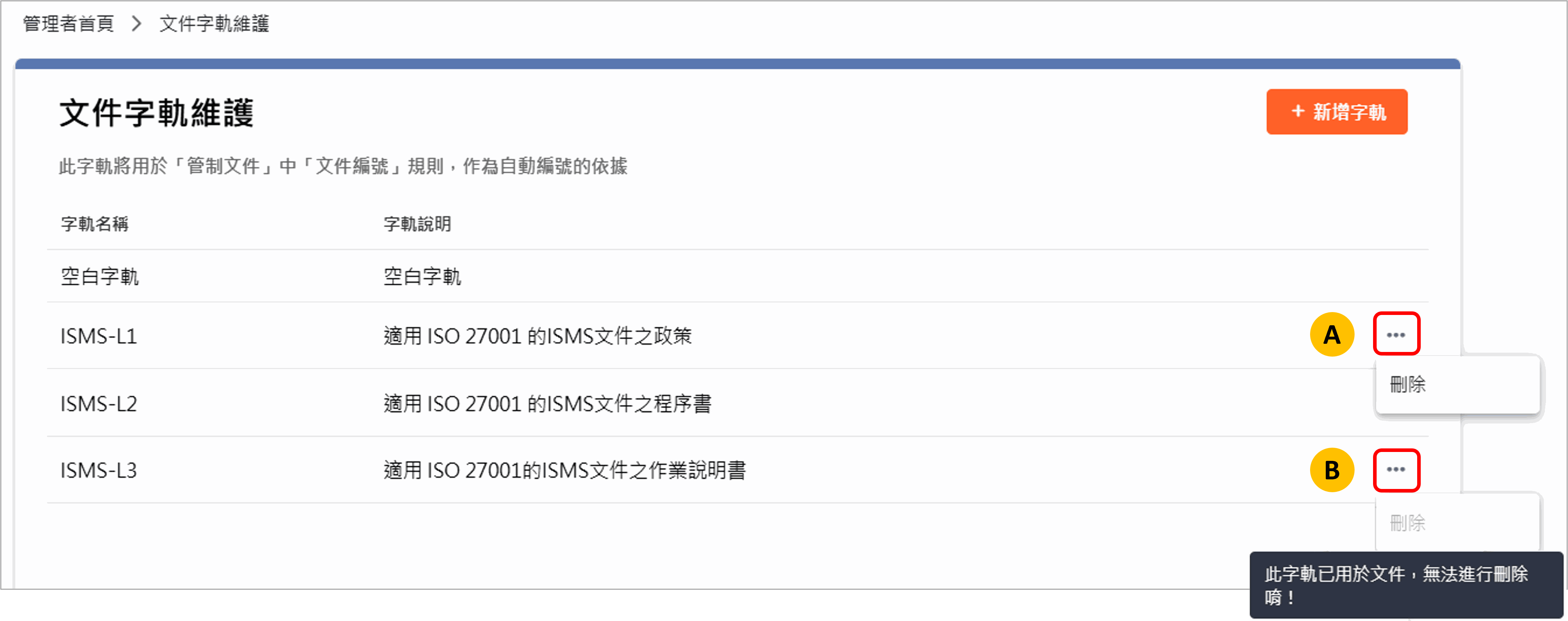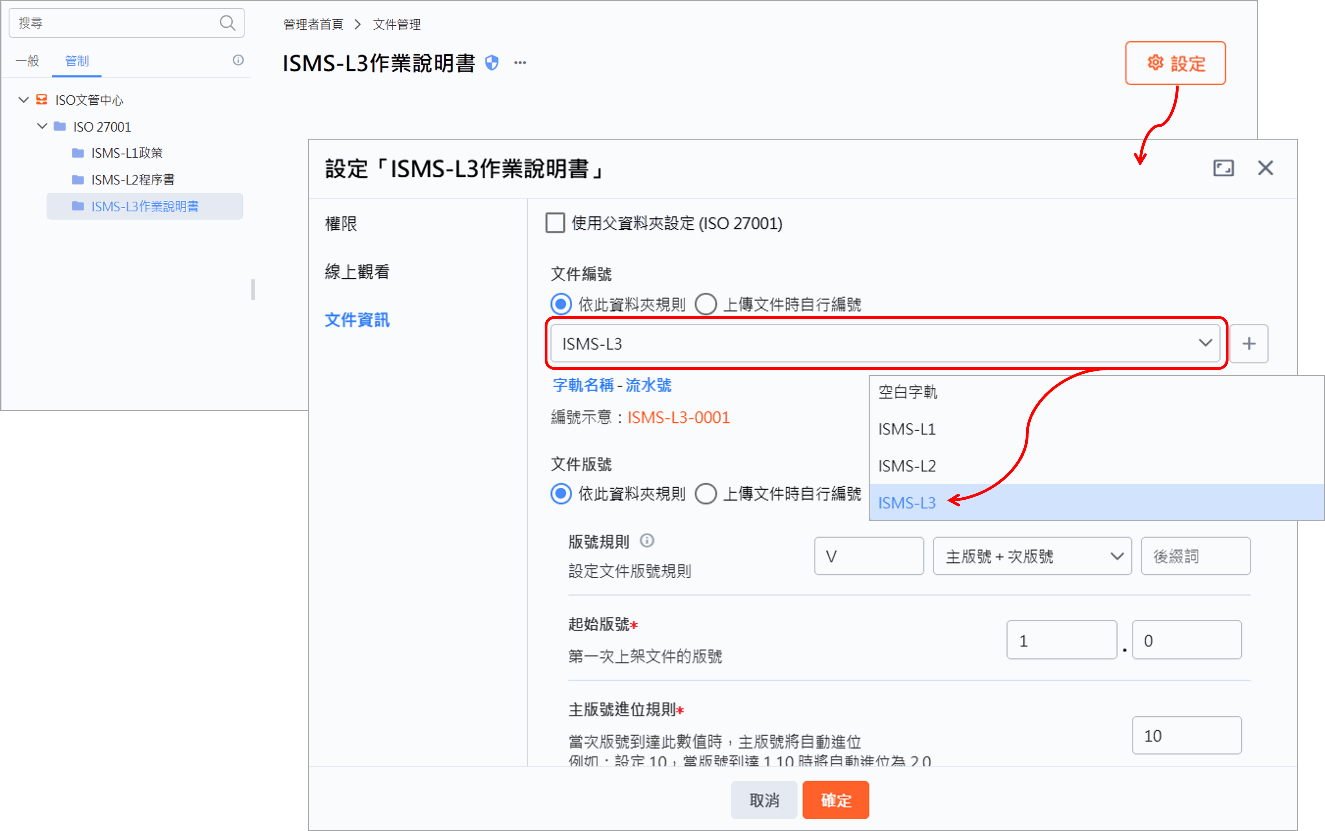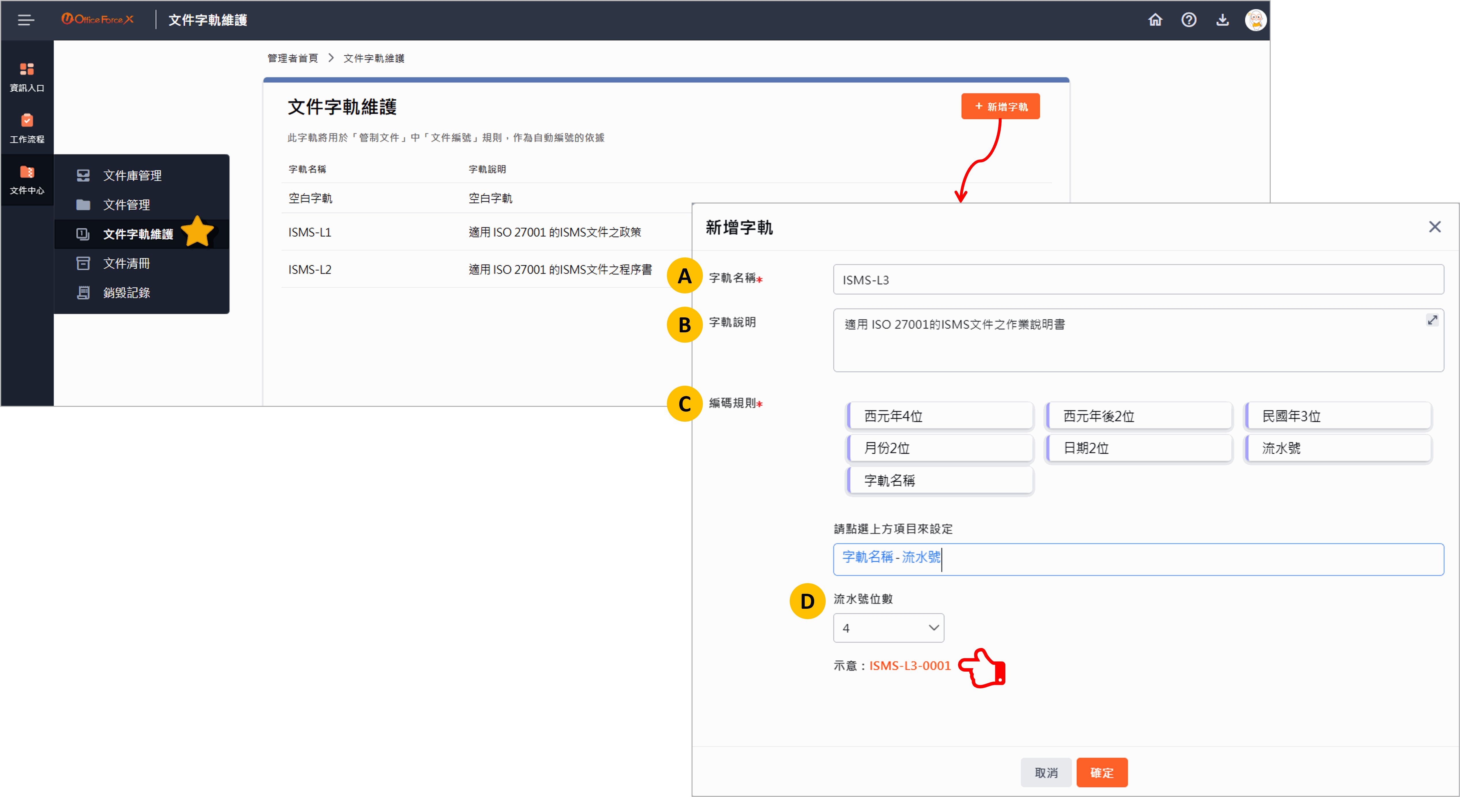 字軌設定 :文件中心管理員 可依照組織需求來定義文件編號的字軌。