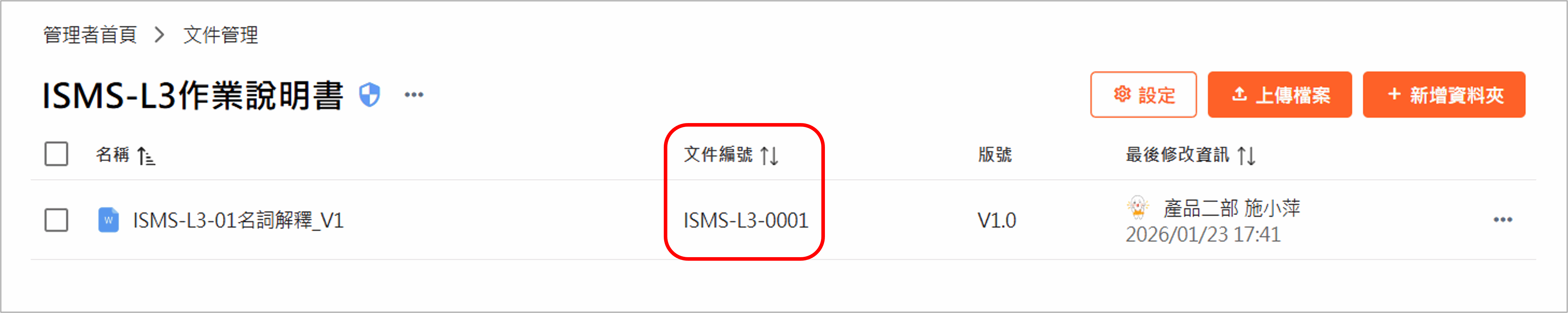 在設定文件庫或資料夾的 文件資訊 時,可選擇到已設定好的字軌來產生 文件編號 ;而使用者新增文件時會按照系統所設定之字軌 自動產生編號。