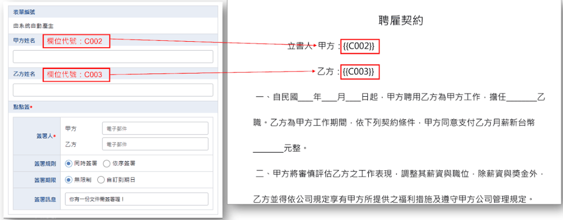 - 設定可填寫甲方/乙方的欄位 (限定:單行文字或多行文字) ,且甲方/乙方的欄位代號必須跟上述「聘僱契約範本」的{{欄位代號}}一致
