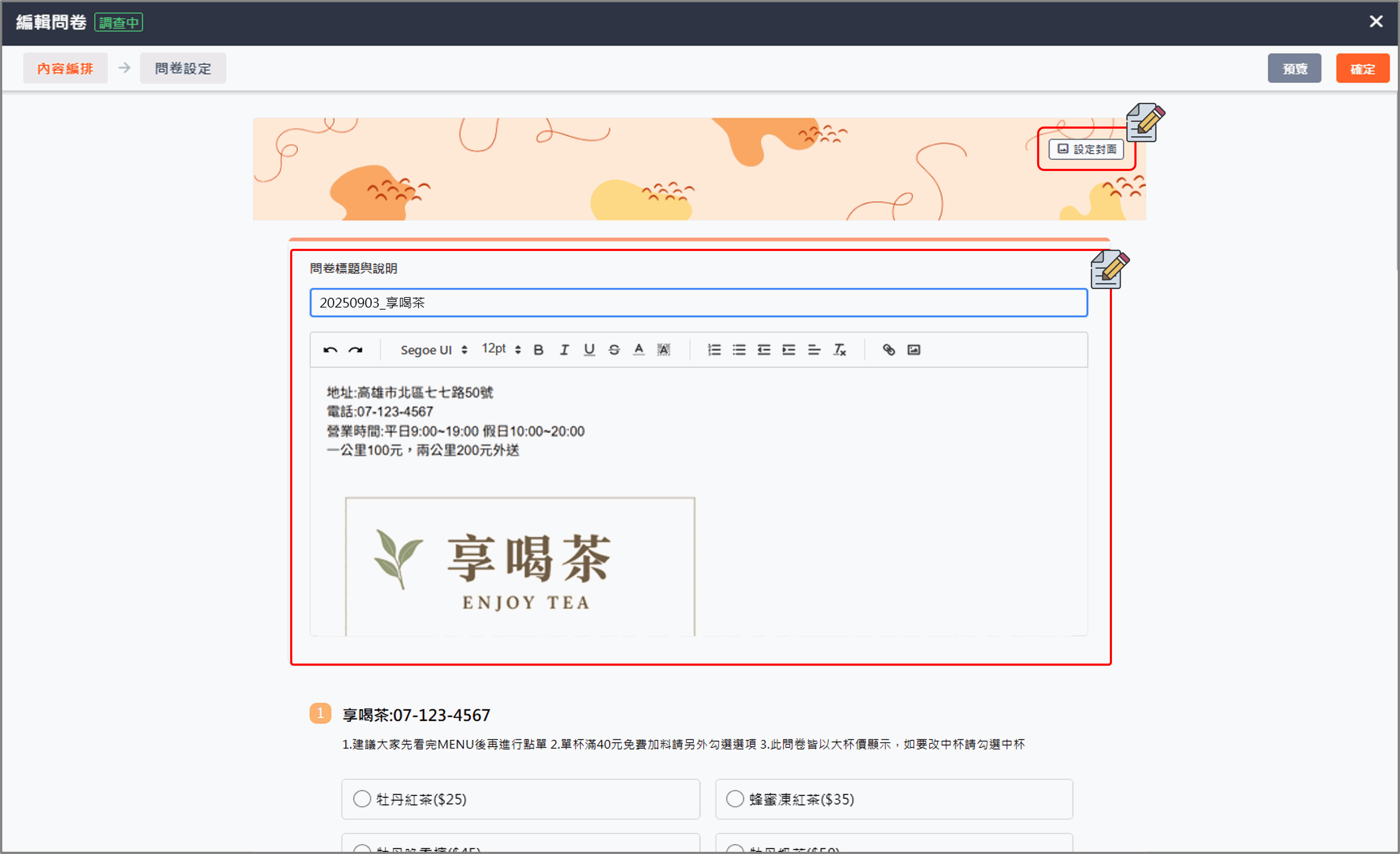 - 系統提供多元的[文字編輯器]可製作問卷說明內容,可讓設計者輕鬆地添加文字與自由調整字體顏色或樣式。