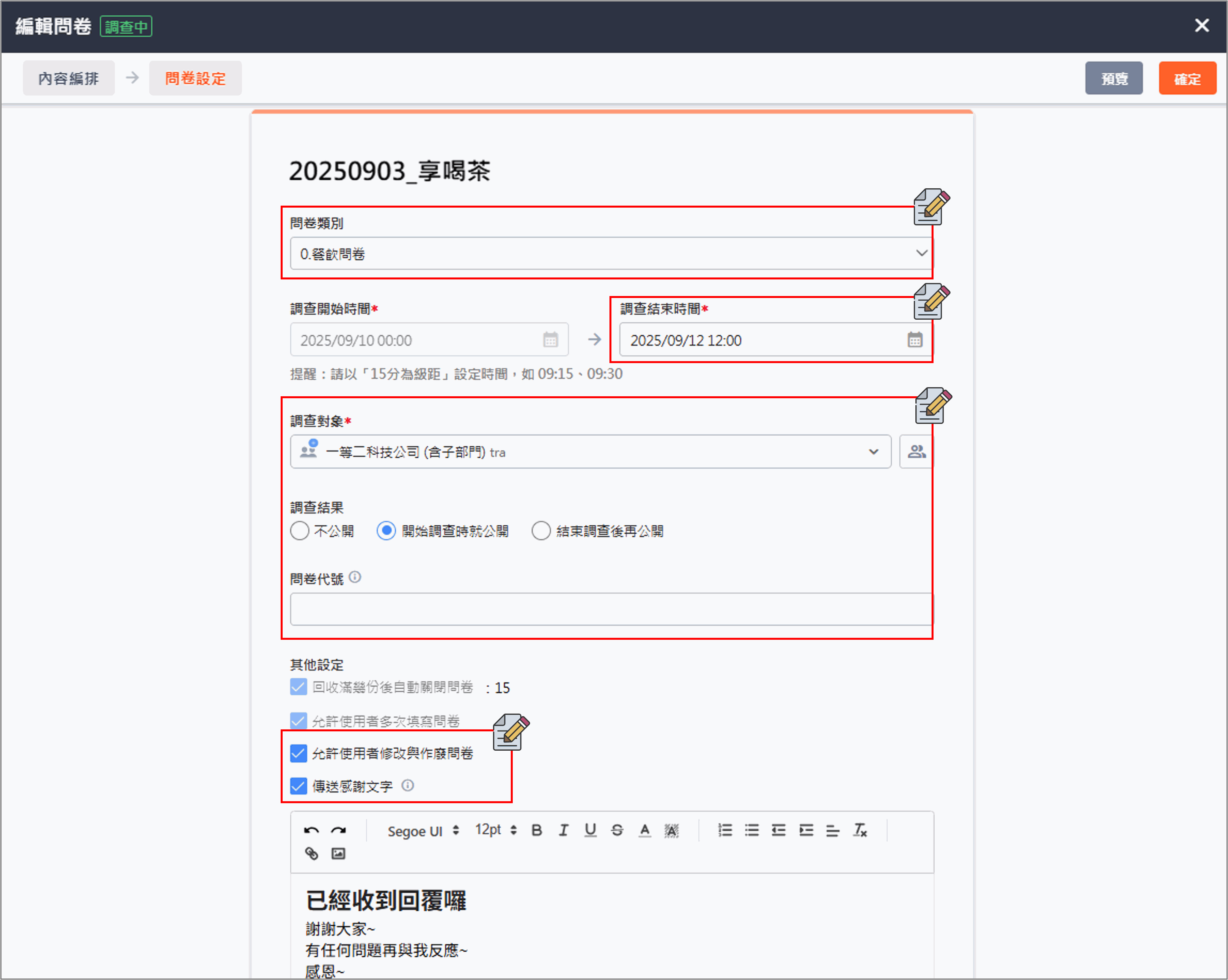 - 【問卷設定】問卷類別、調整調查對象、調查結果是否公開、問卷代號、是否允許使用者修改、傳送感謝文字