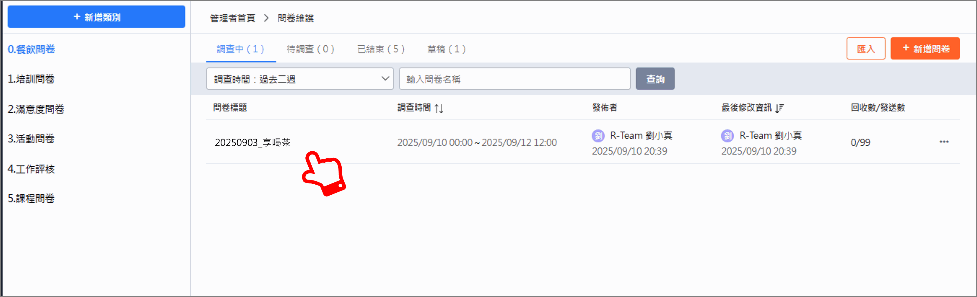 - 1.草稿列表:存放尚未完成編輯的問卷,方便設計者搭配工作時間完善問卷需要的內容。
