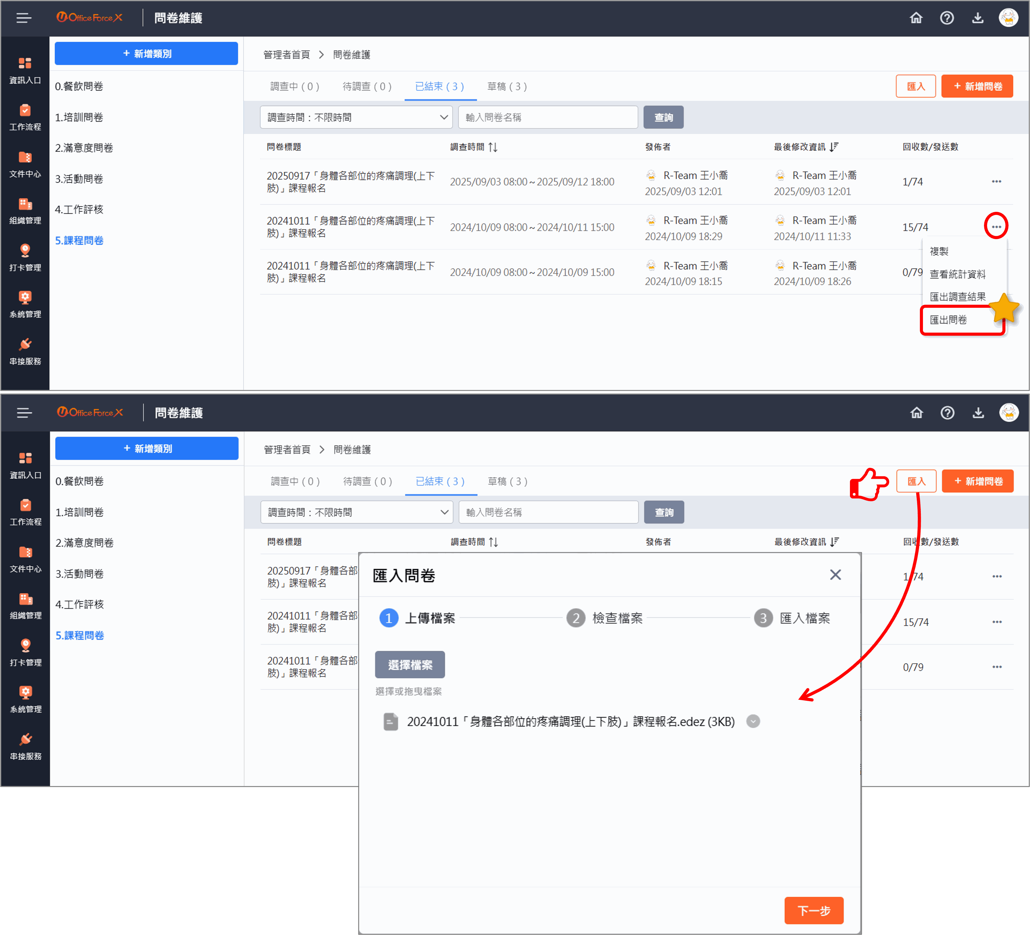 系統也提供 匯出 與 匯入 功能,讓您可以快速生成新的問卷草稿,以進行設計與調整。