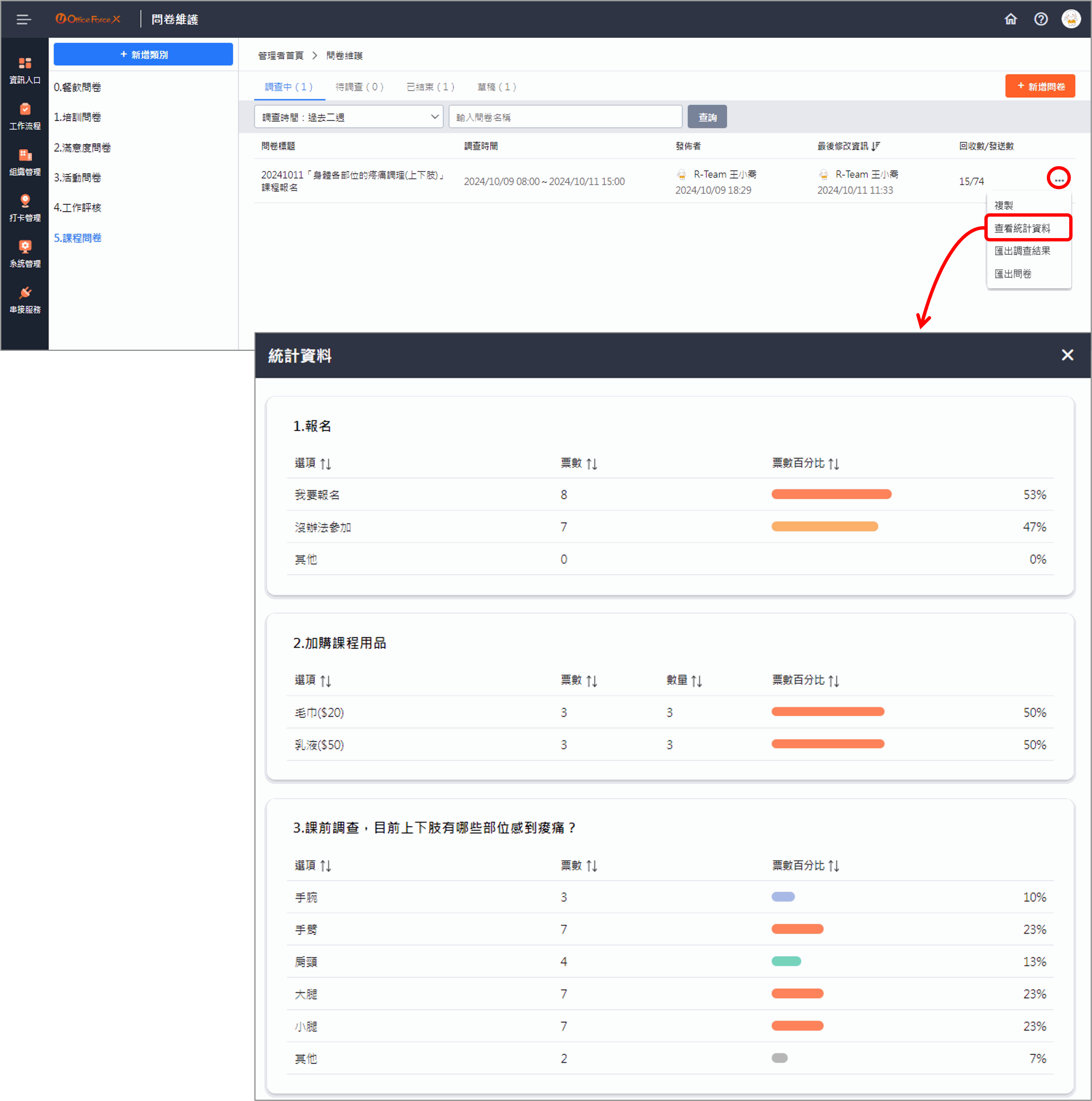 問卷設計者 可以對[調查中]與[已結束]的問卷,點選 查看統計資料,查看到該問卷針對[單選題]與[複選題]各個選項的 票數、數量、票數百分比 等統計資料。