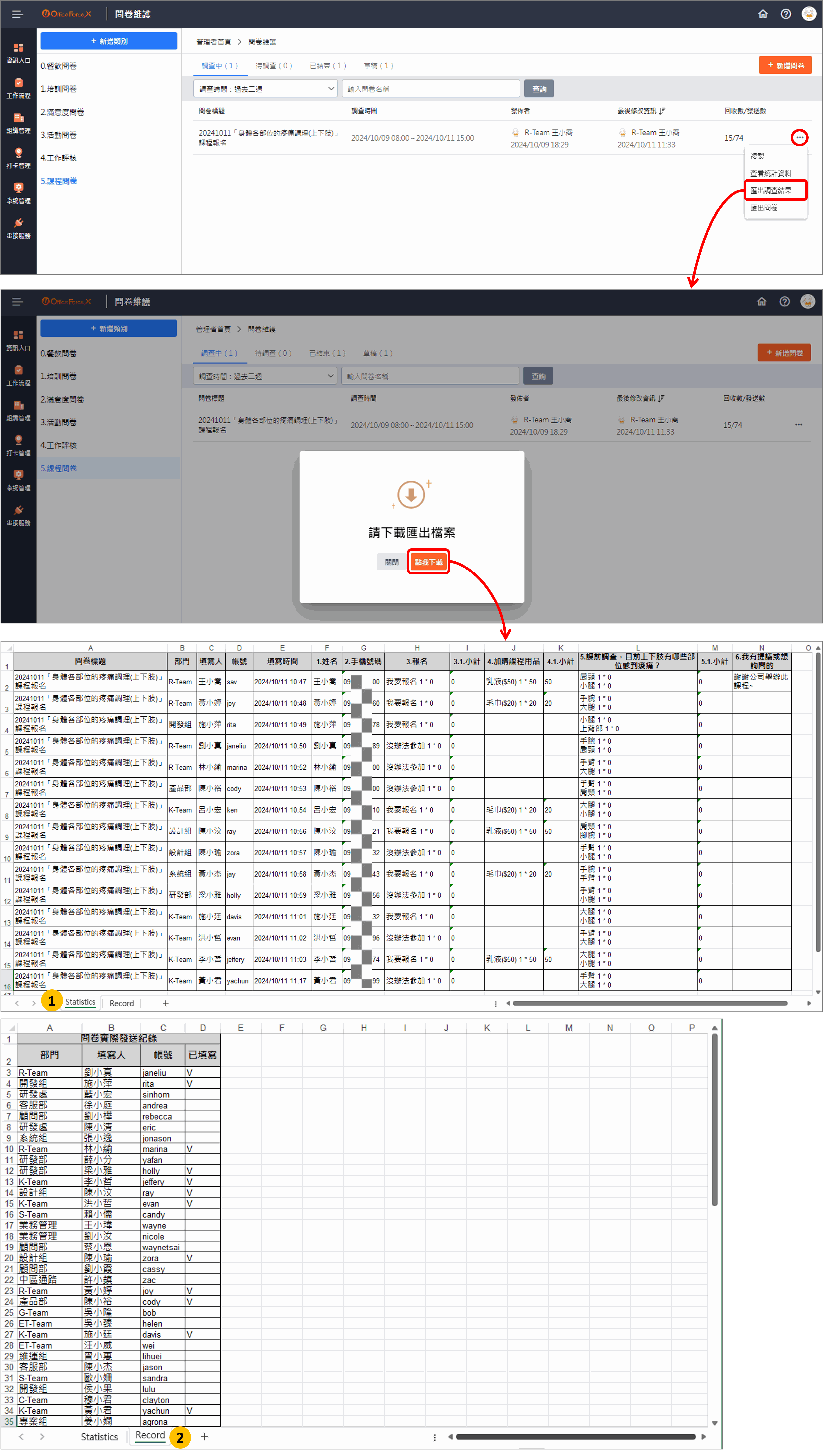問卷設計者 可以對[調查中]與[已結束]的問卷,點選 匯出調查結果,系統將會自動匯出Excle檔案,檔案內會分別提供下列統計資料,以便管理者進行彙整。