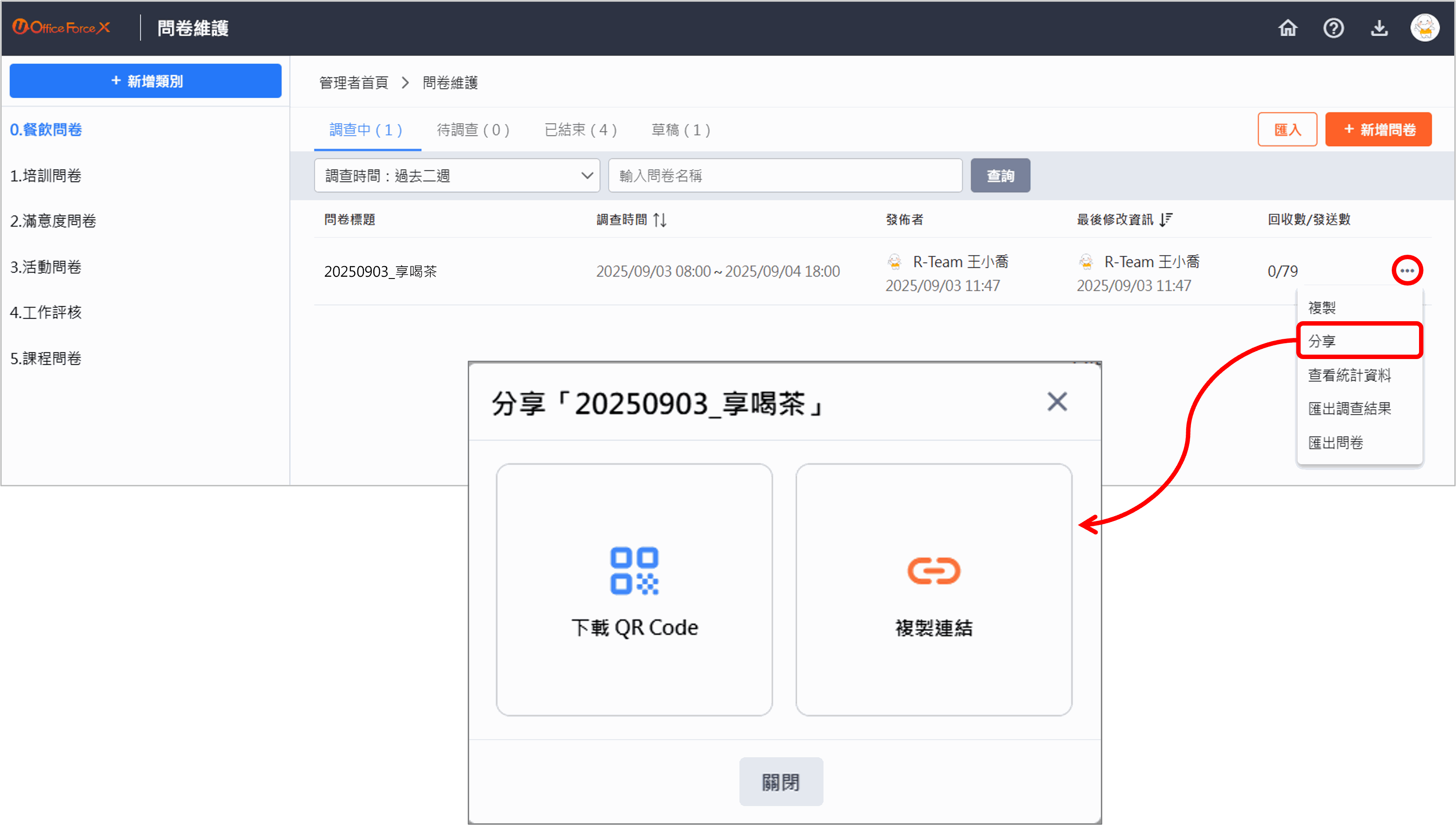 針對 調查中 的問卷,系統提供快速 分享問卷 的方式,方便您透過不同管道(如 E-Mail、通訊軟體、簡報、海報或公告印刷品等) 對內部或外部發佈問卷調查。