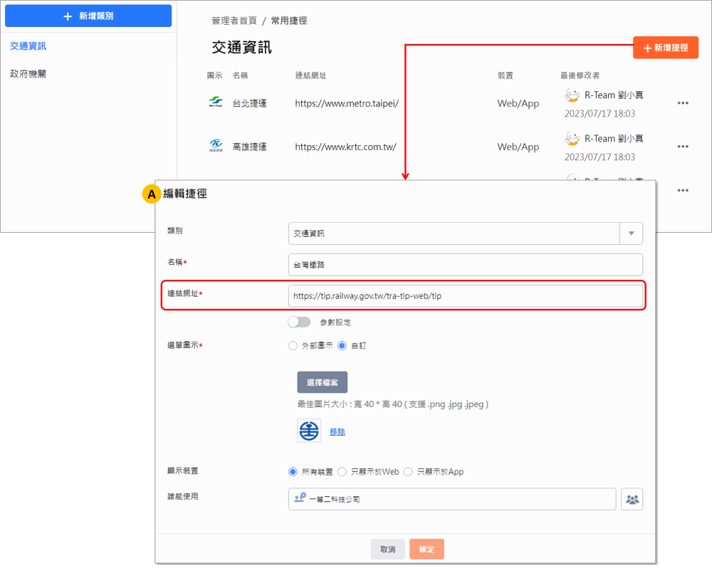若捷徑點擊後即可前往該站台, 資訊入口管理員 可以直接設定要連結的網址,並且可以自行上傳要顯示的圖片樣式。例如:組織可以設定交通類相關網站,方便使用者快速前往。