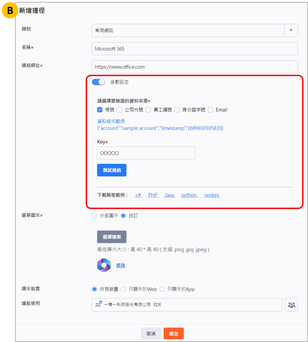 當該捷徑需要透過參數進行身分驗證才能開啟該站台,資訊入口管理員 可以啟用 參數設定 ,啟用後可以進行以下項目設定: