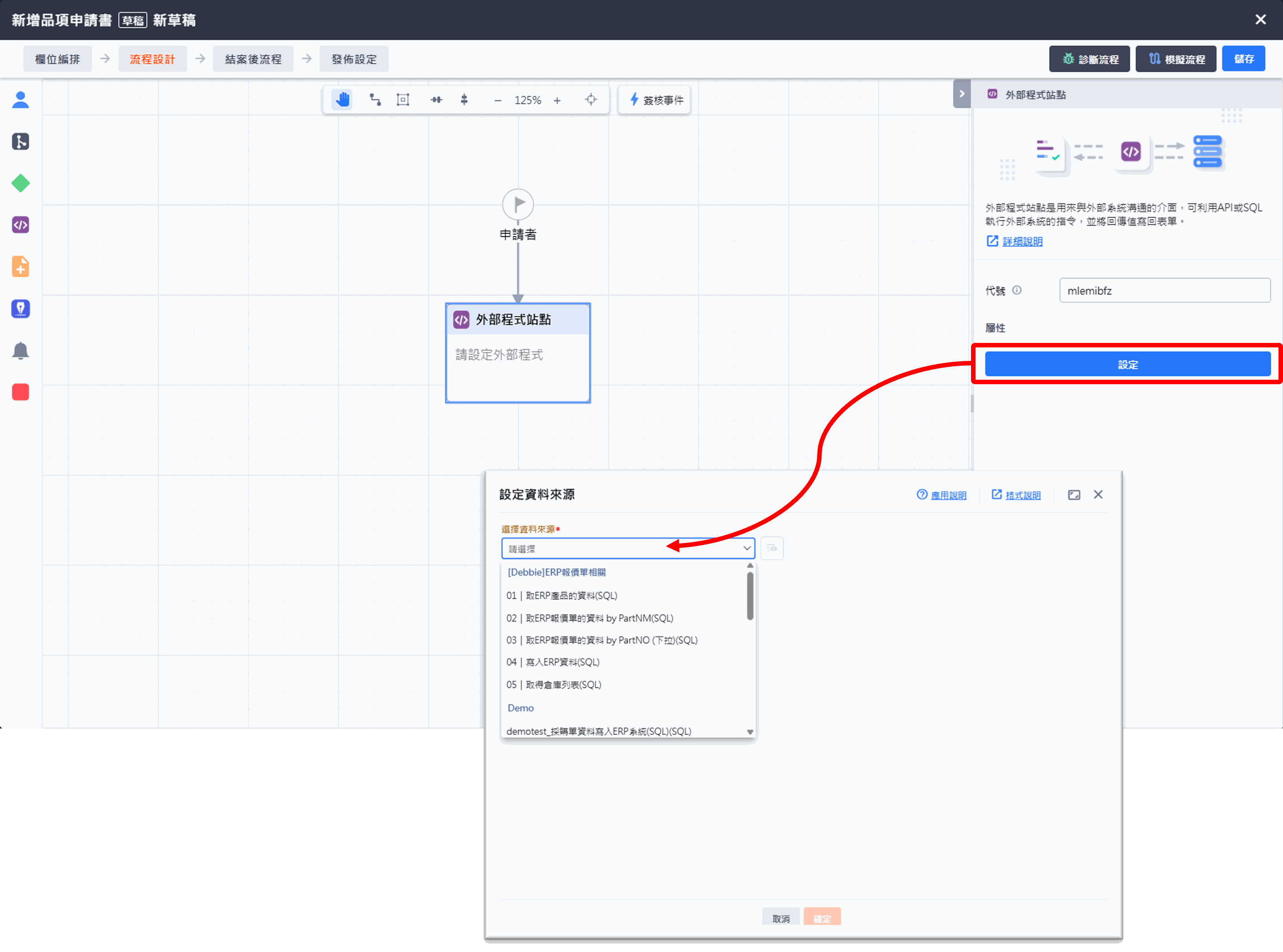 當設定好 外部資料來源 後,表單設計者 可以在流程設計中,根據組織的商業邏輯,在流程中加入 外部程式站點,並且依序填完成以下設定:
