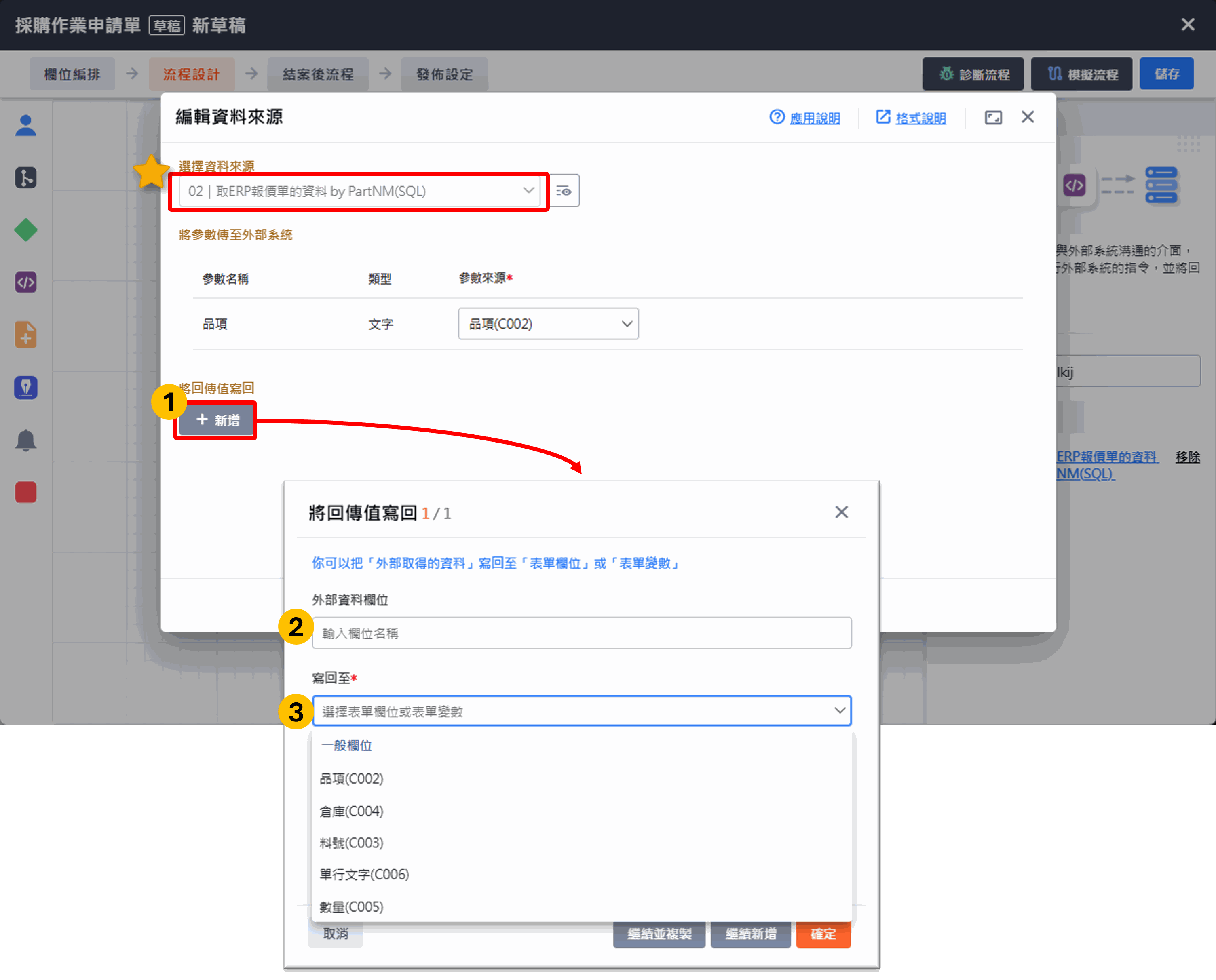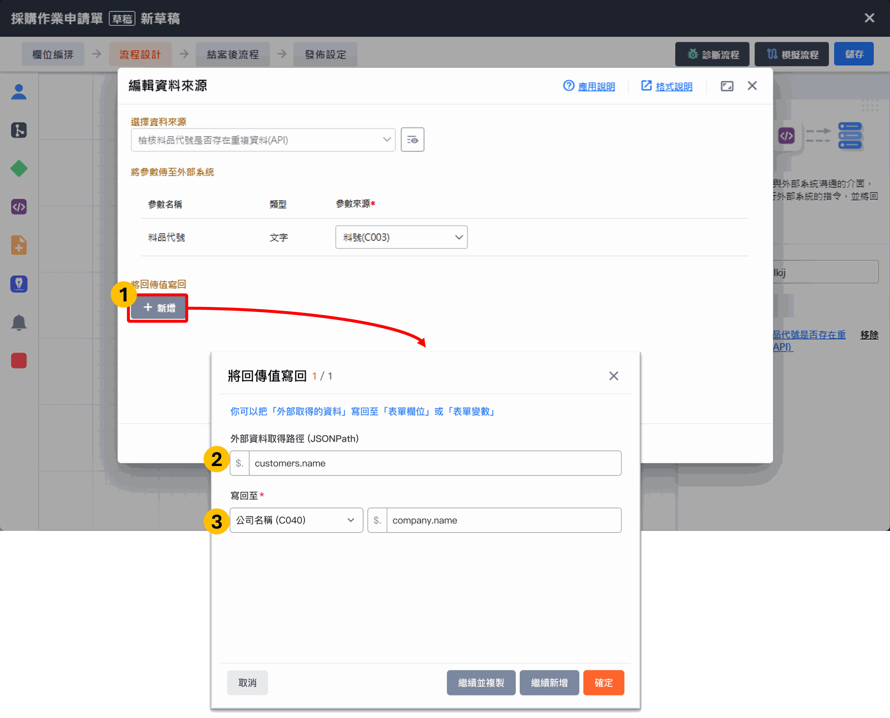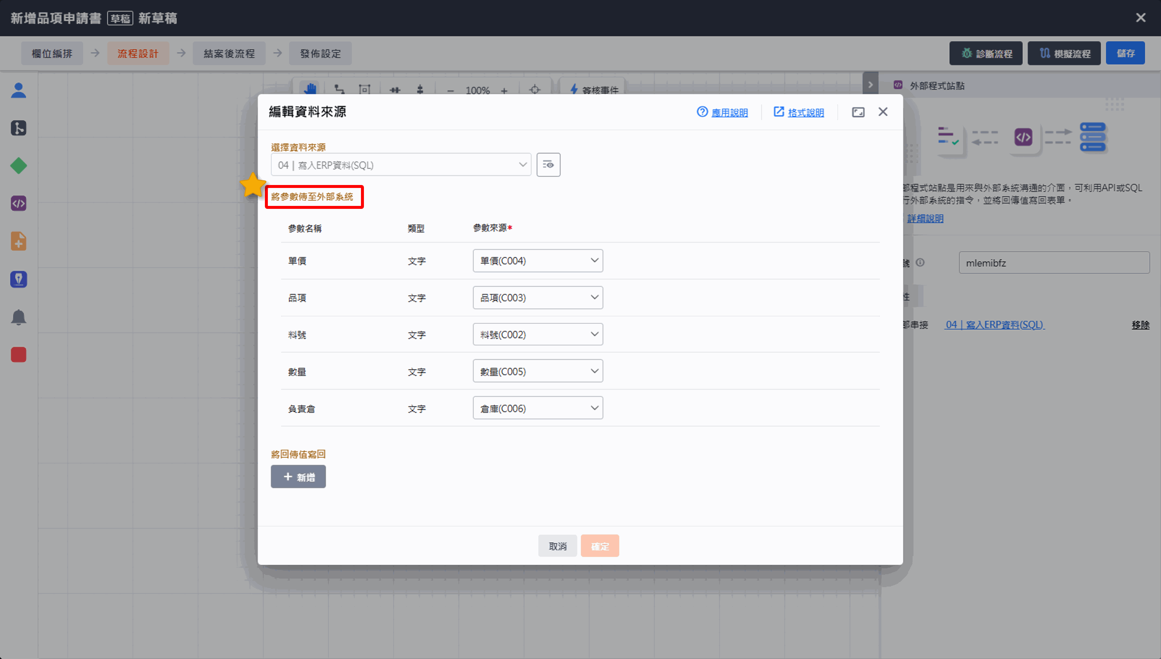 回傳值寫回方式:需根據不同類型的資料來源(SQL、API),需填寫對應所需要的資料
