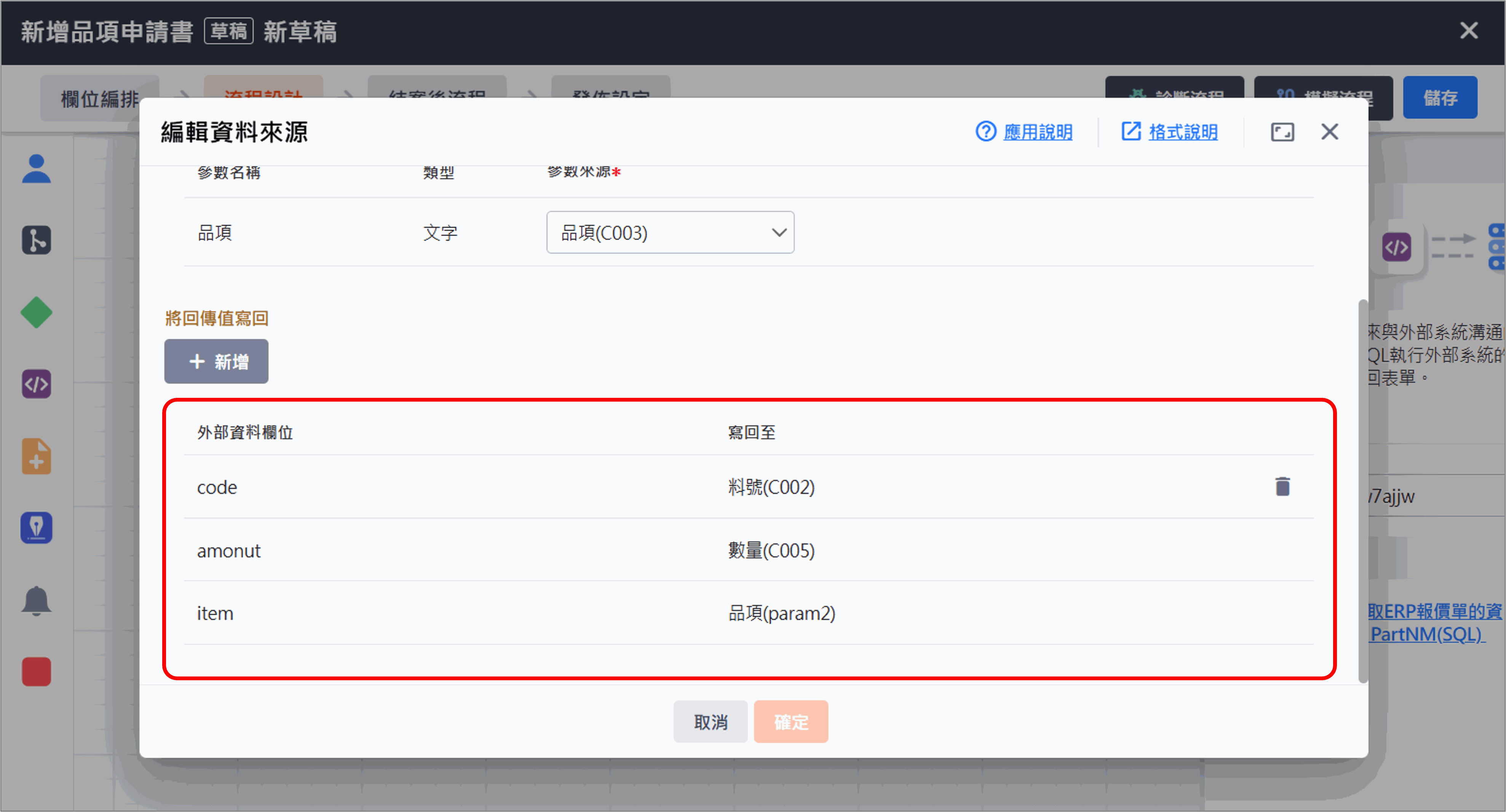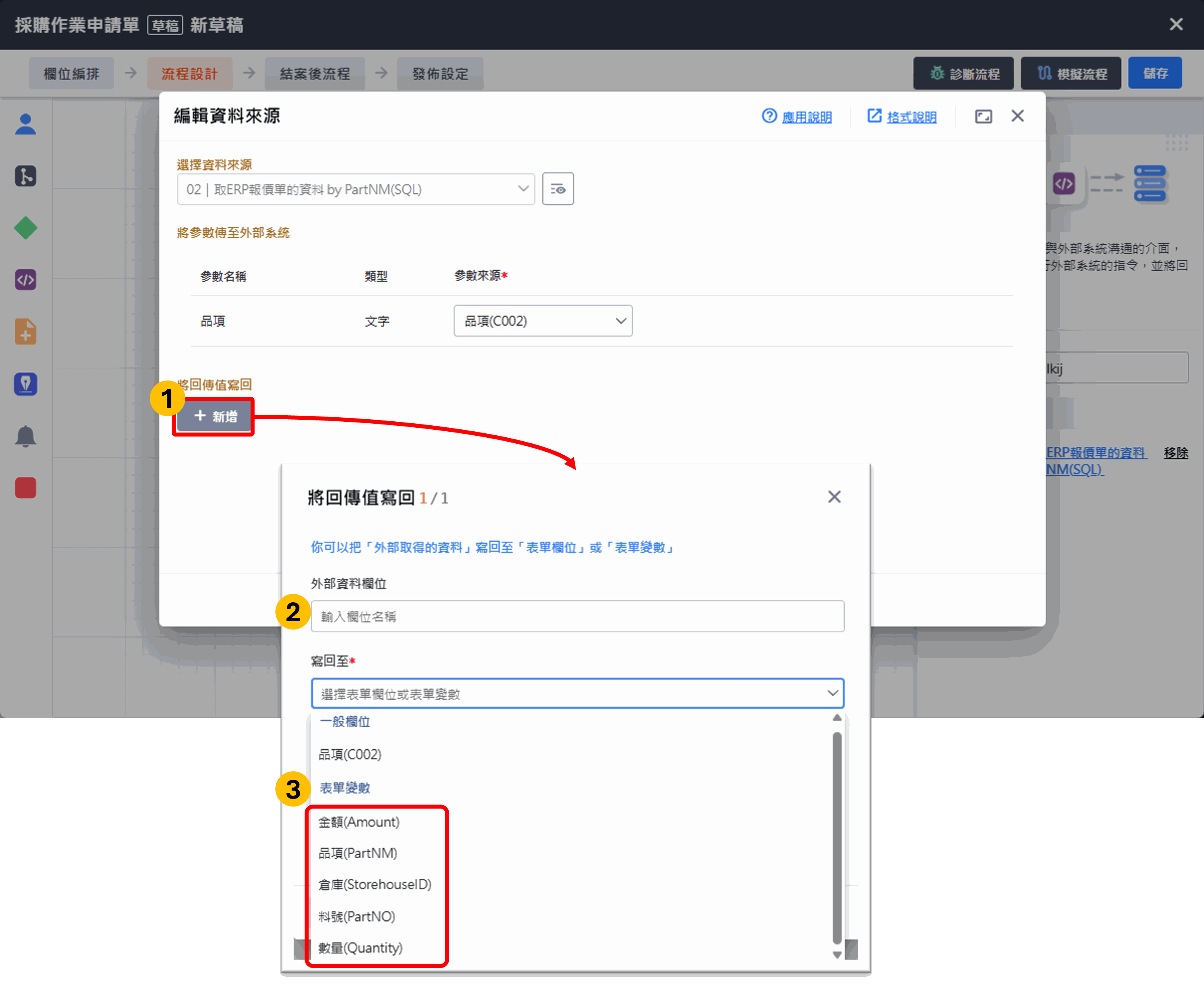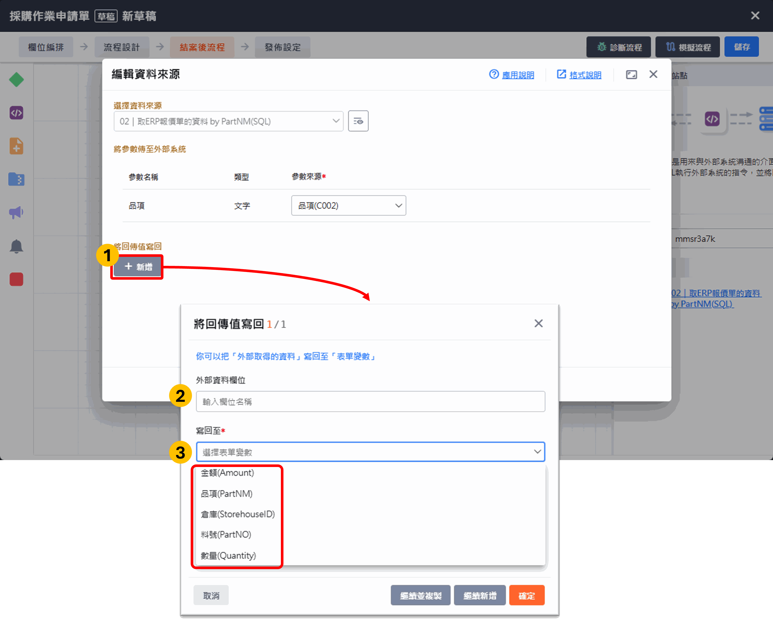 回傳值寫回方式:需根據不同類型的資料來源(SQL、API),需填寫對應所需要的資料