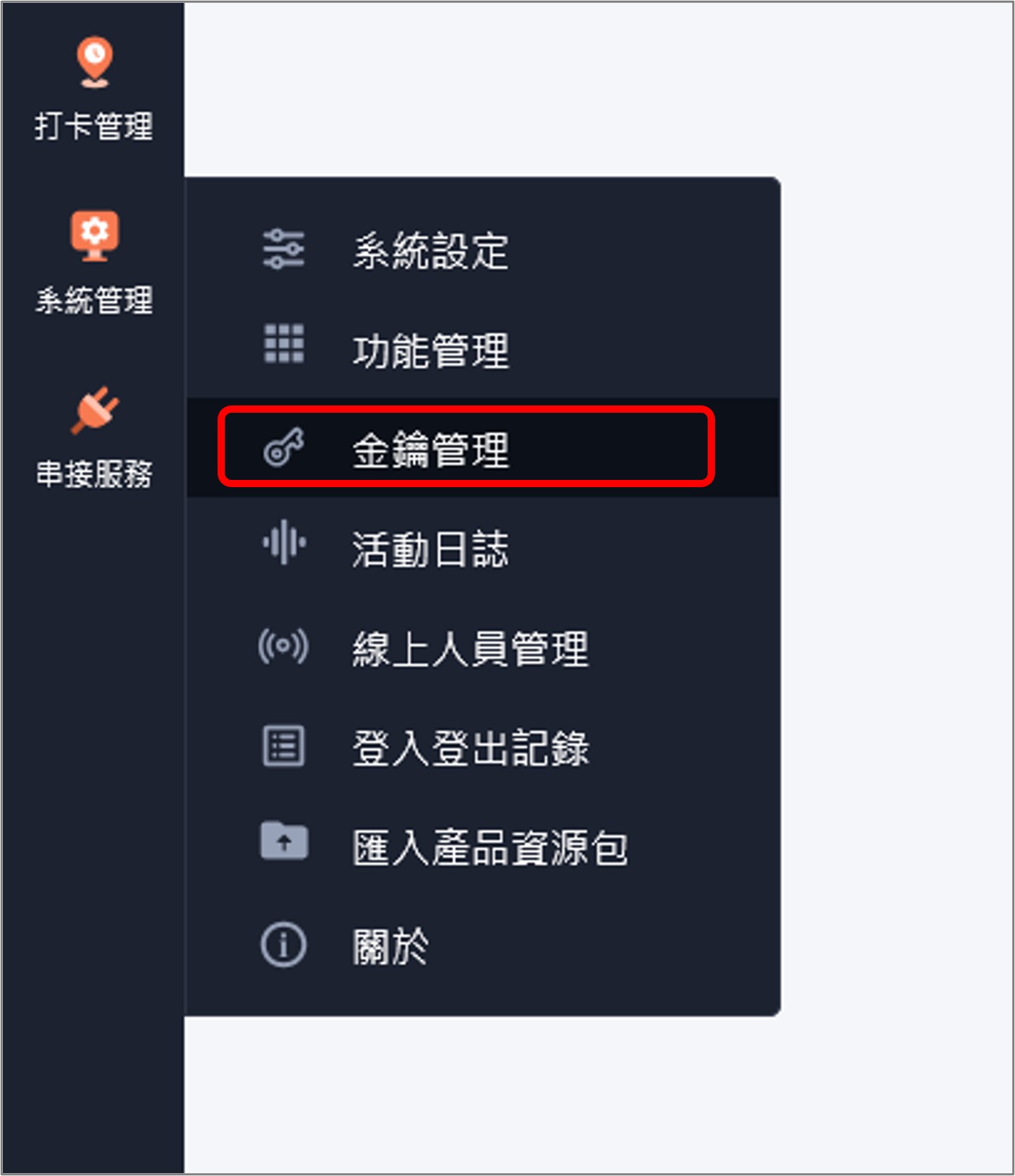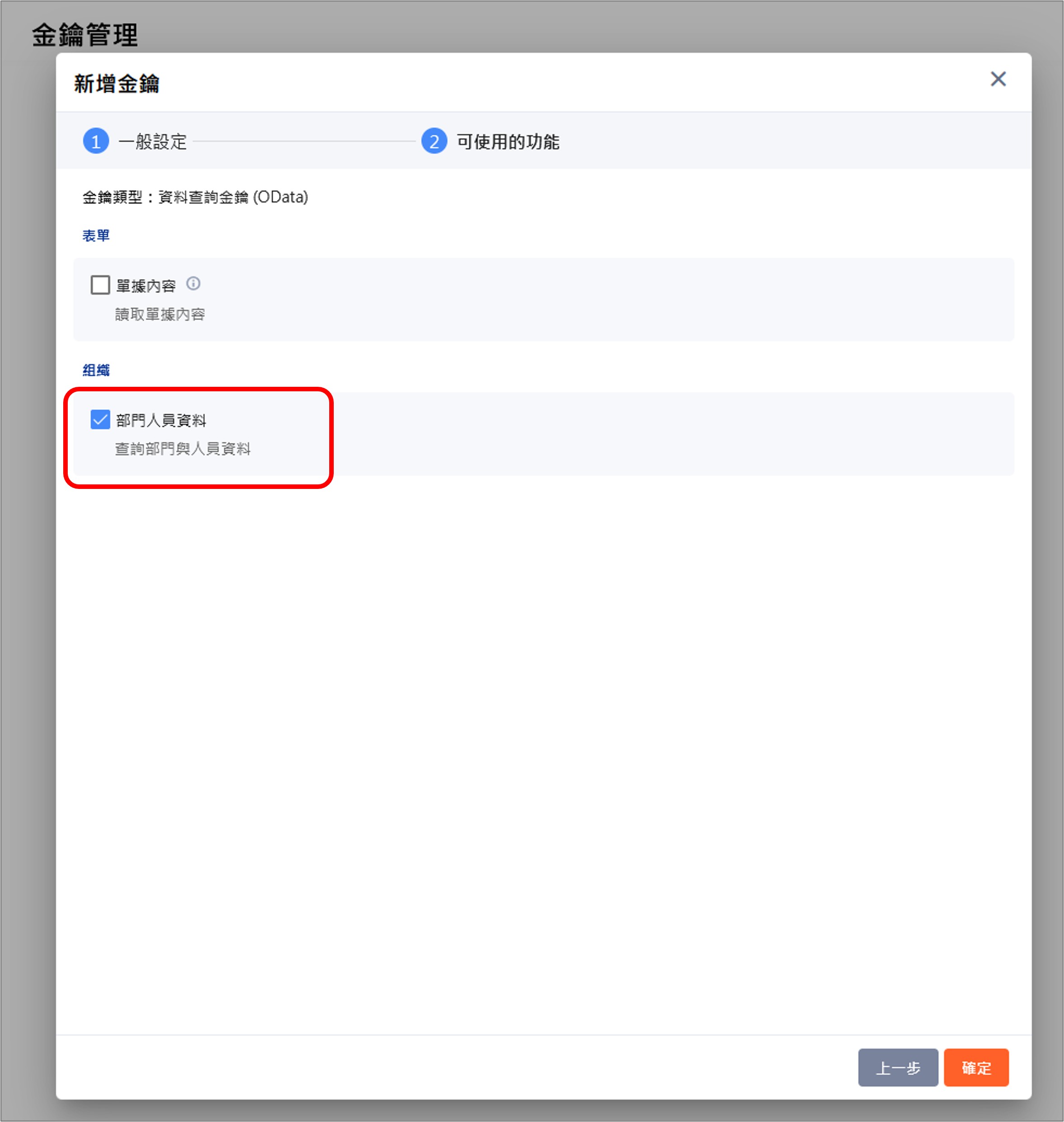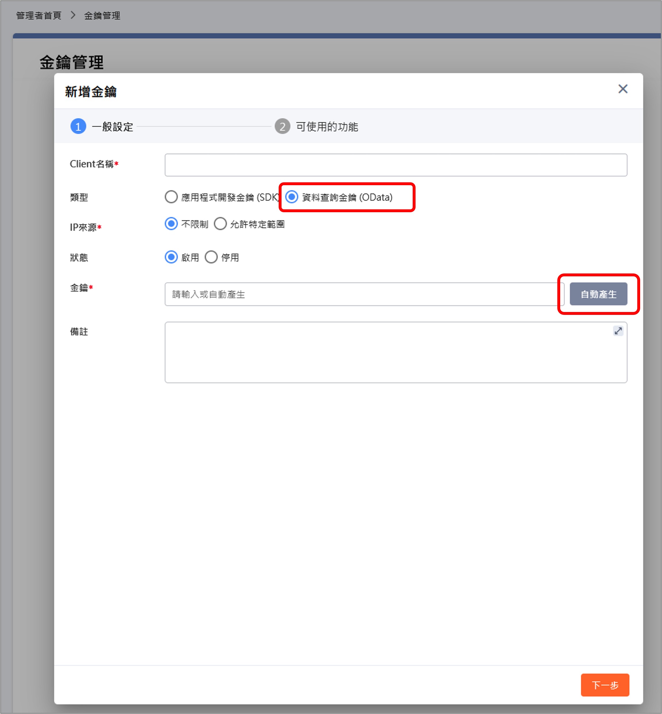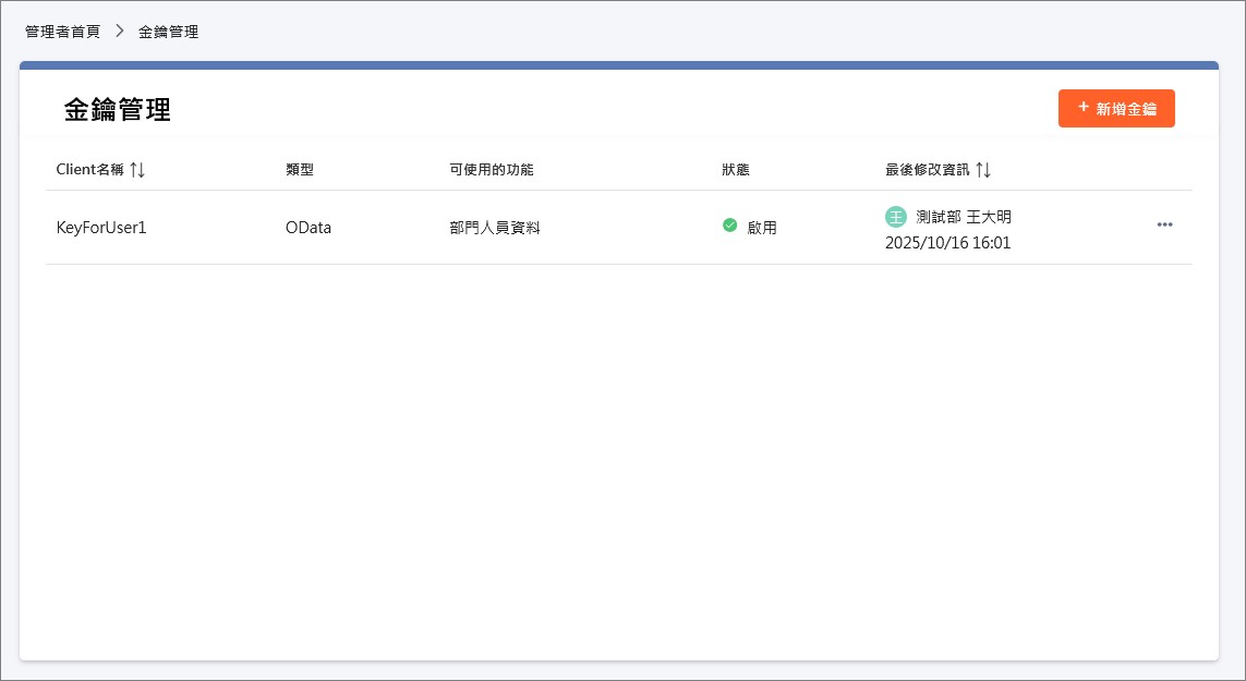製作特定的 API KEY 管理者建立 API KEY¶ 管理者登入 U-Office Force X 系統中,切換成管理者身分 使用 API Management 功能以建立 API KEY 點擊 [+新增金鑰] 輸入建立 API Key 必要的參數 設定參數的 Client名稱, 並指定為 OData, 產生一組 API Key 設定支援的模組 API KEY 建立完畢 最後管理者需要把 KEY 的 Client Name 與 API Key 給報表設計者即可