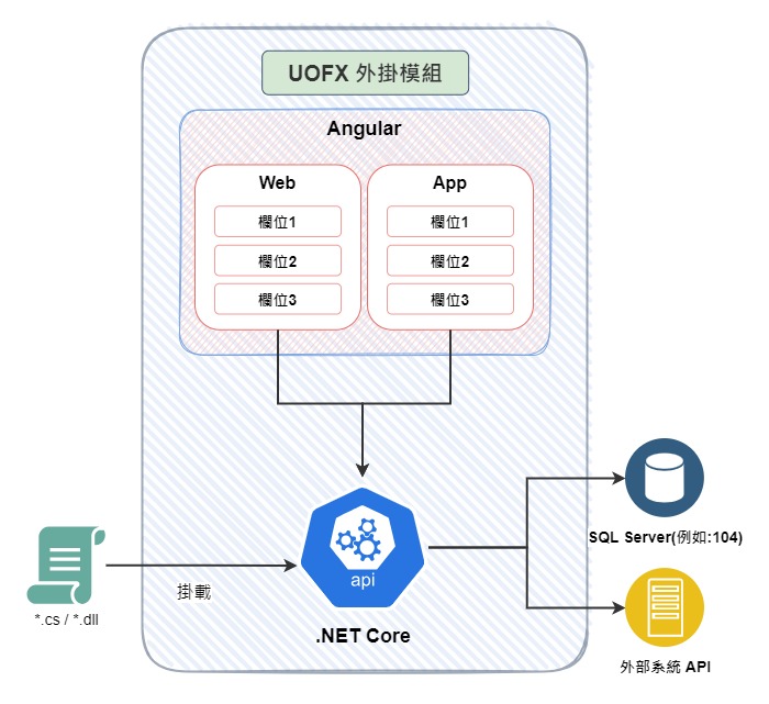 外掛模組採用前後端分離架構:前端 (Angular + TypeScript) 實作外掛欄位的主要功能,後端 (.NET Core Web API) 可依需求客製化或抽換,透過 SPA Proxy 提供一站式開發服務。主要功能在前端,後端可抽換且不影響與 UOF X 的相容性,並可作為中間層連接外部服務。