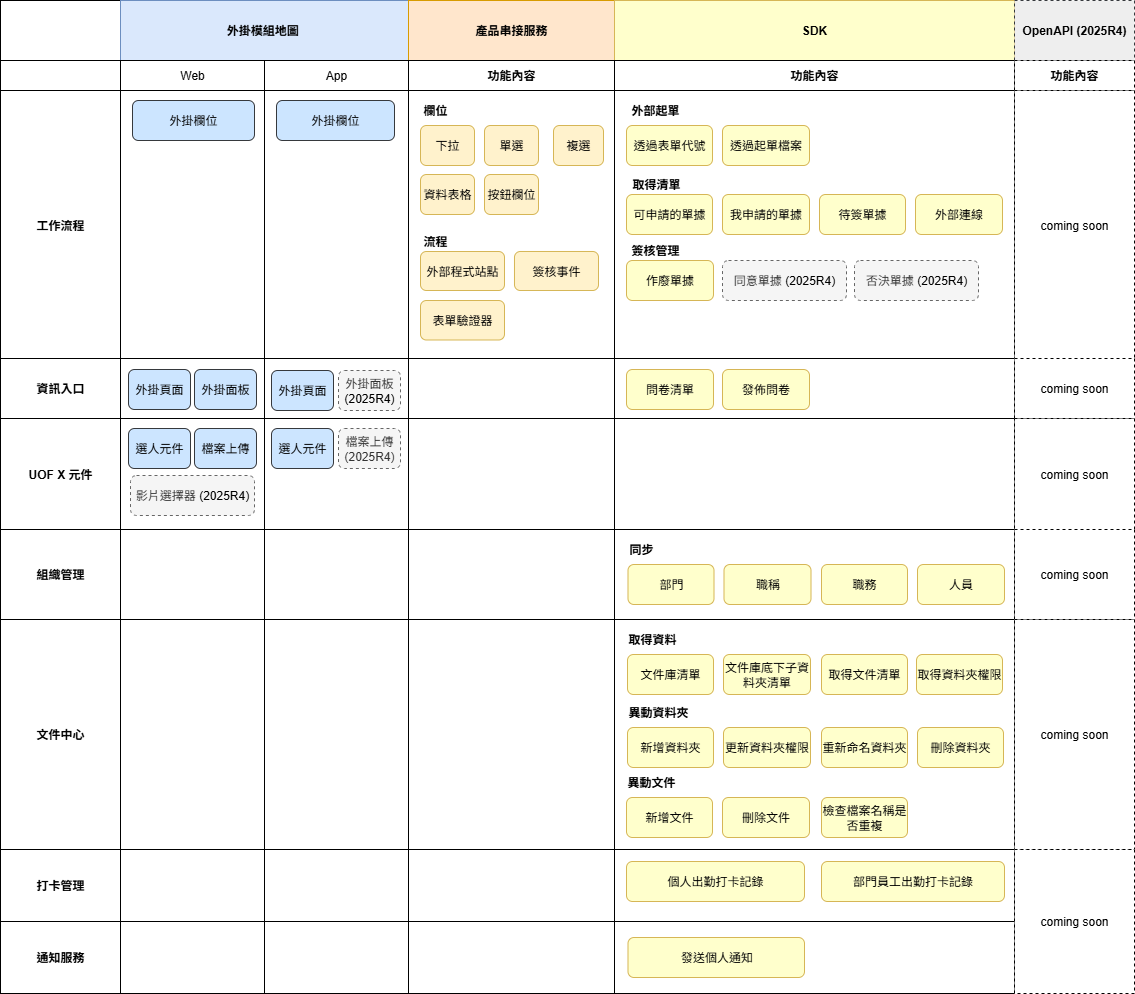 - 安全性 : SDK 與 UOF X 站台間透過加密傳輸,並針對不同外部系統可提供不同金鑰,並可分別進行 IP 白名單限制,發現異常流量時,也可即時關閉對應的 SDK 接口。