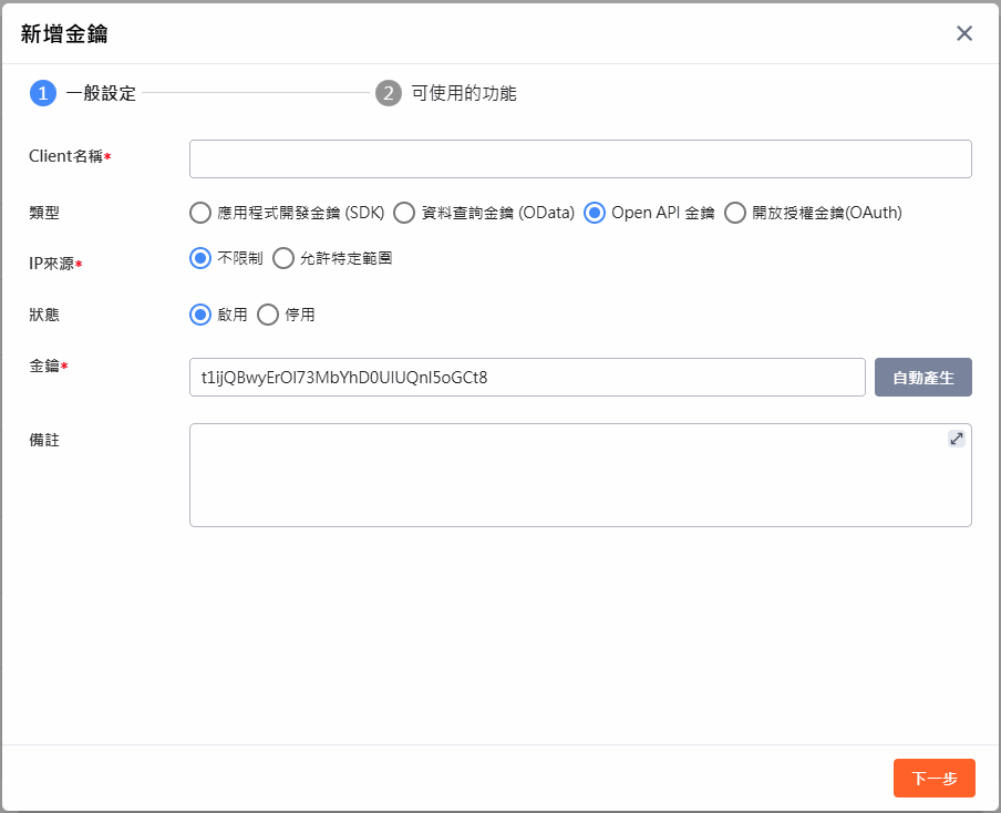 使用 OpenAPI 必須擁有一組專屬金鑰。UOF X 允許針對不同的外部系統(例如:ERP、HR、CIM...)分別建立專屬的 金鑰,並給予不同的權限與參數設定。
