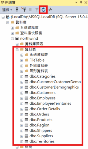 northwind,點擊 執行 - 確認 northwind 資料庫已載入:點擊重新整理資料庫,確認資料表已載入