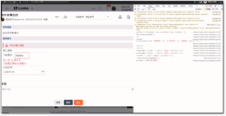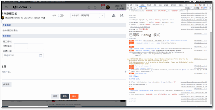 如何 Debug 透過瀏覽器開發人員工具¶ 可打開瀏覽器的開發人員工具(F12),透過主控台的頁籤功能中觀察前端是否已有錯誤訊息,也可在外掛欄位的*.ts檔案中寫console.log(),偵測錯誤原因。 Chrome 開發人員工具 啟用外掛欄位偵錯模式¶ 由開發人員工具的主控台中可輸入指令enableUofDebugMode(),可查看 UOF X 載入外掛欄位時成功或失敗相關訊息內容。 啟用外掛欄位偵錯模式